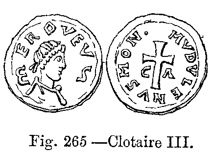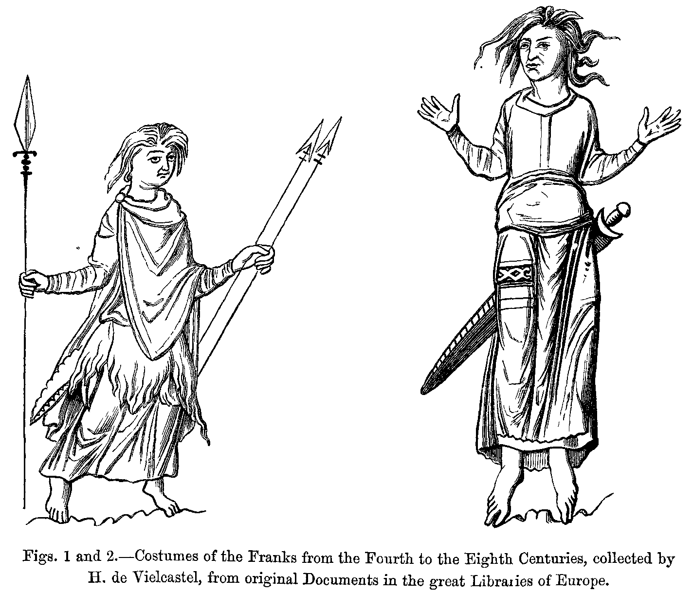 As far as the monumental relics of those remote times allow us to judge, the dress as worn by Clovis underwent but trifing modifications during the first dvnasty; but during the reigns of Pepin and Charlemagne considerable changes were effected, which resulted from the intercourse, either of a friendly or hostile nature, between the Franks and the southern nations. About this time, silk stuffs were introduced into the kingdom, and the upper classes, in order to distinguish themselves from the lower, had their garments trimmed round with costly furs (see chapter on Commerce).