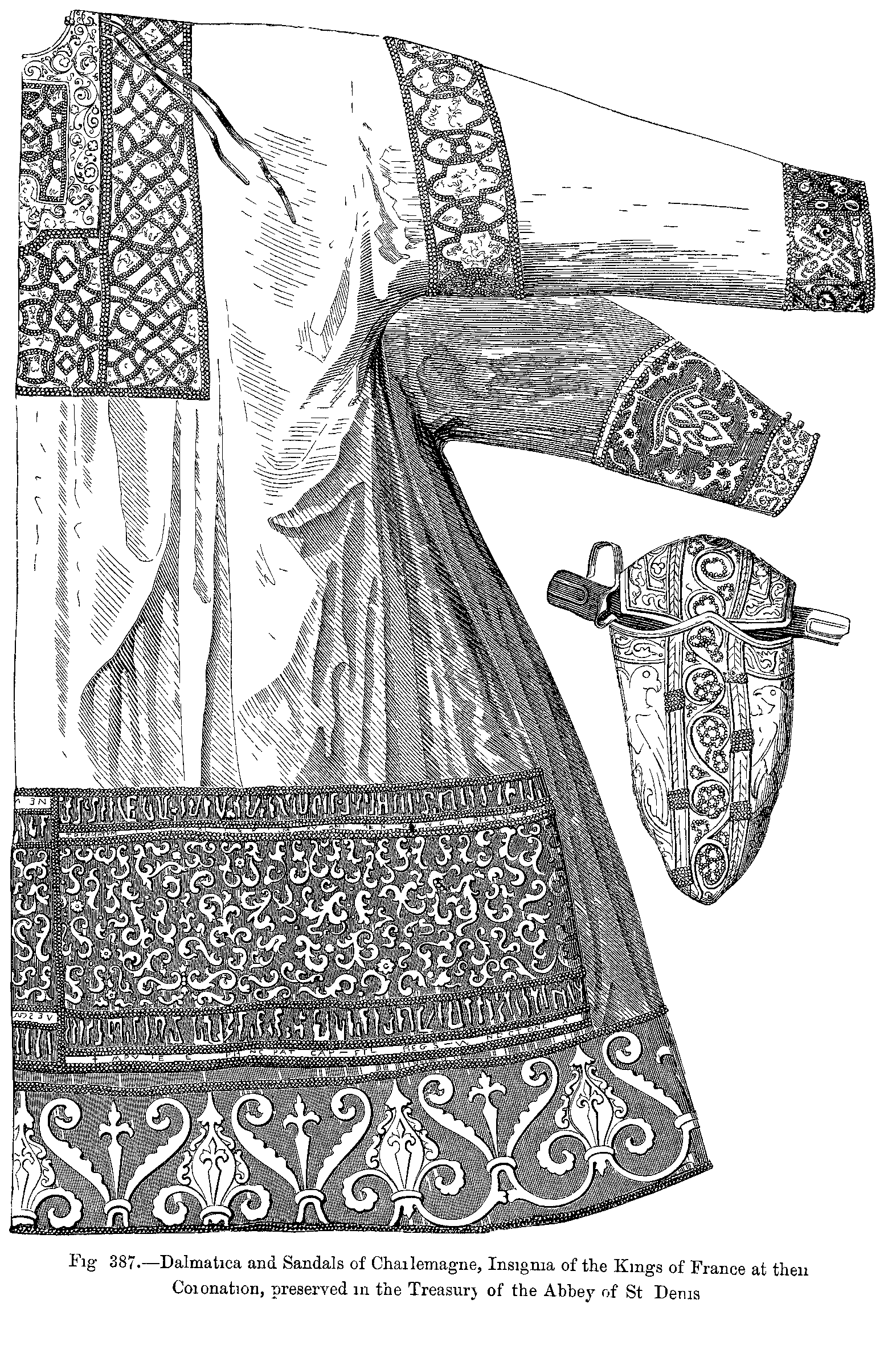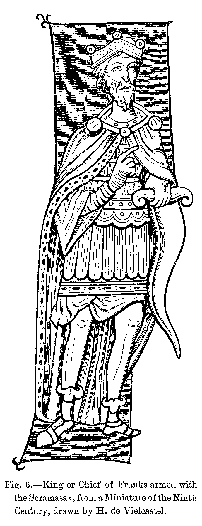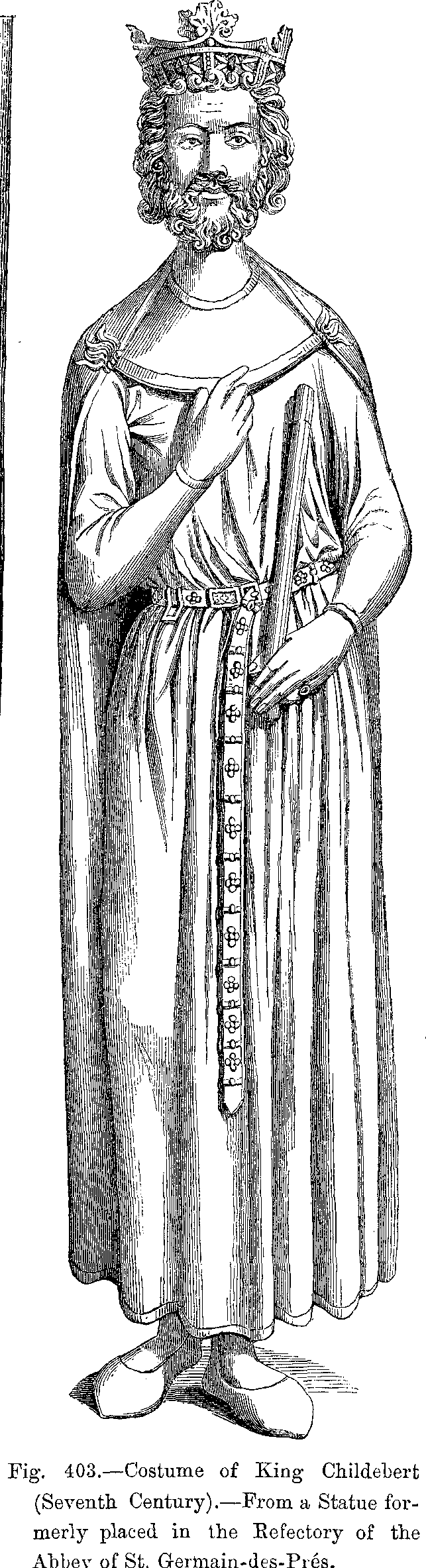 Fig. 403.--Costume of King Childebert (Seventh Century).--From a Statue formerly placed in the Refectory of the Abbey of St. Germain-des-Prés.