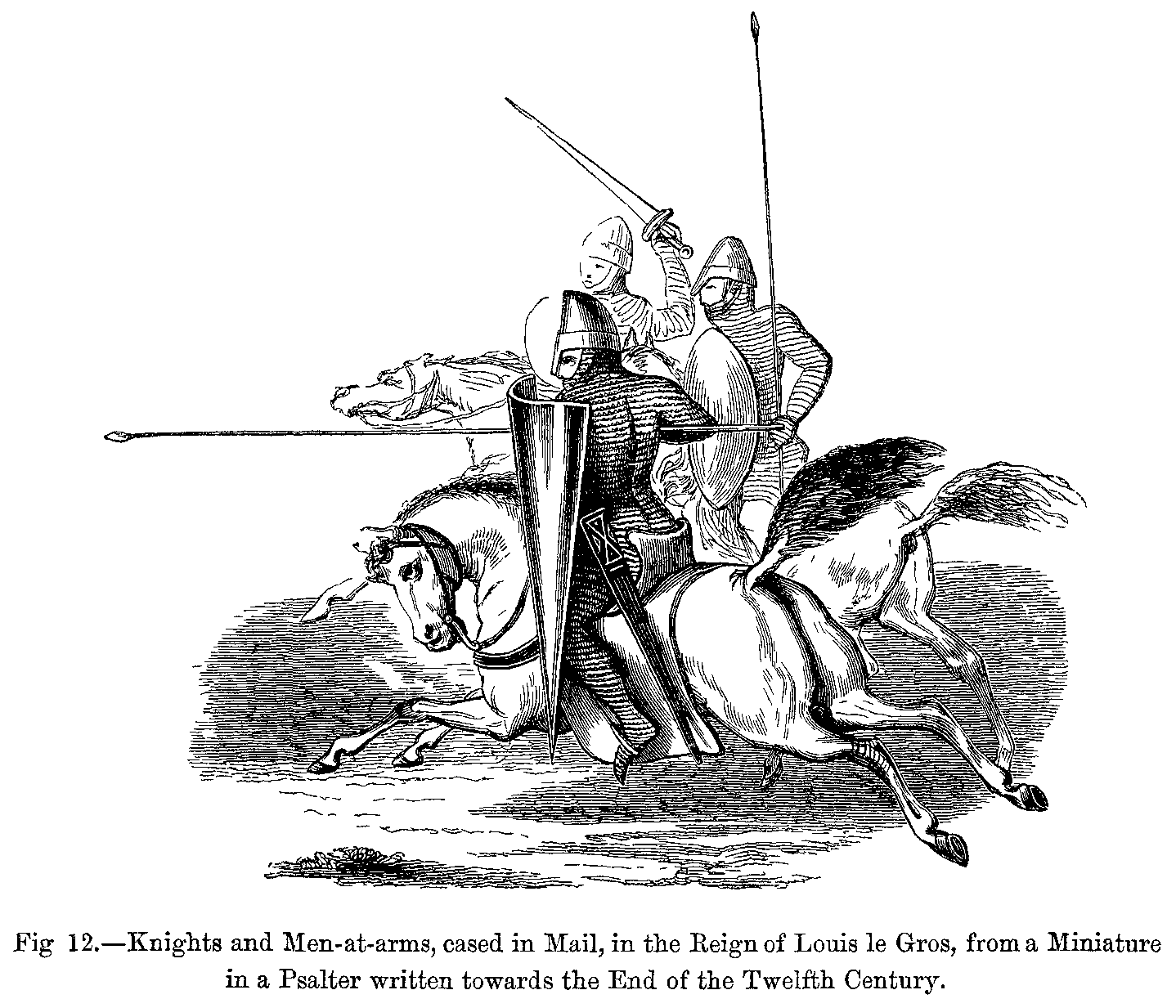 We cannot find that any very decided change was made in dress before the end of the eleventh century. The ordinary dress made of thick cloths and of coarse woollen stuffs was very strong and durable, and not easily spoiled; and it was usual, as we still find in some provinces which adhere to old customs, for clothes, especially those worn on festive occasions and at ceremonials, to be handed down as heirlooms from father to son, to the third or fourth generation. The Normans, who came from Scandinavia towards the end of the tenth century, A.D. 970, with their short clothes and coats of mail, at first adopted the dress of the French, and continued to do so in all its various changes. In the following century, having found the Saxons and Britons in England clad in the garb of their ancestors, slightly modified by the Roman style of apparel, they began to make great changes in their manner of dressing themselves. They more and more discarded Roman fashions, and assumed similar costumes to those made in France at the same period.