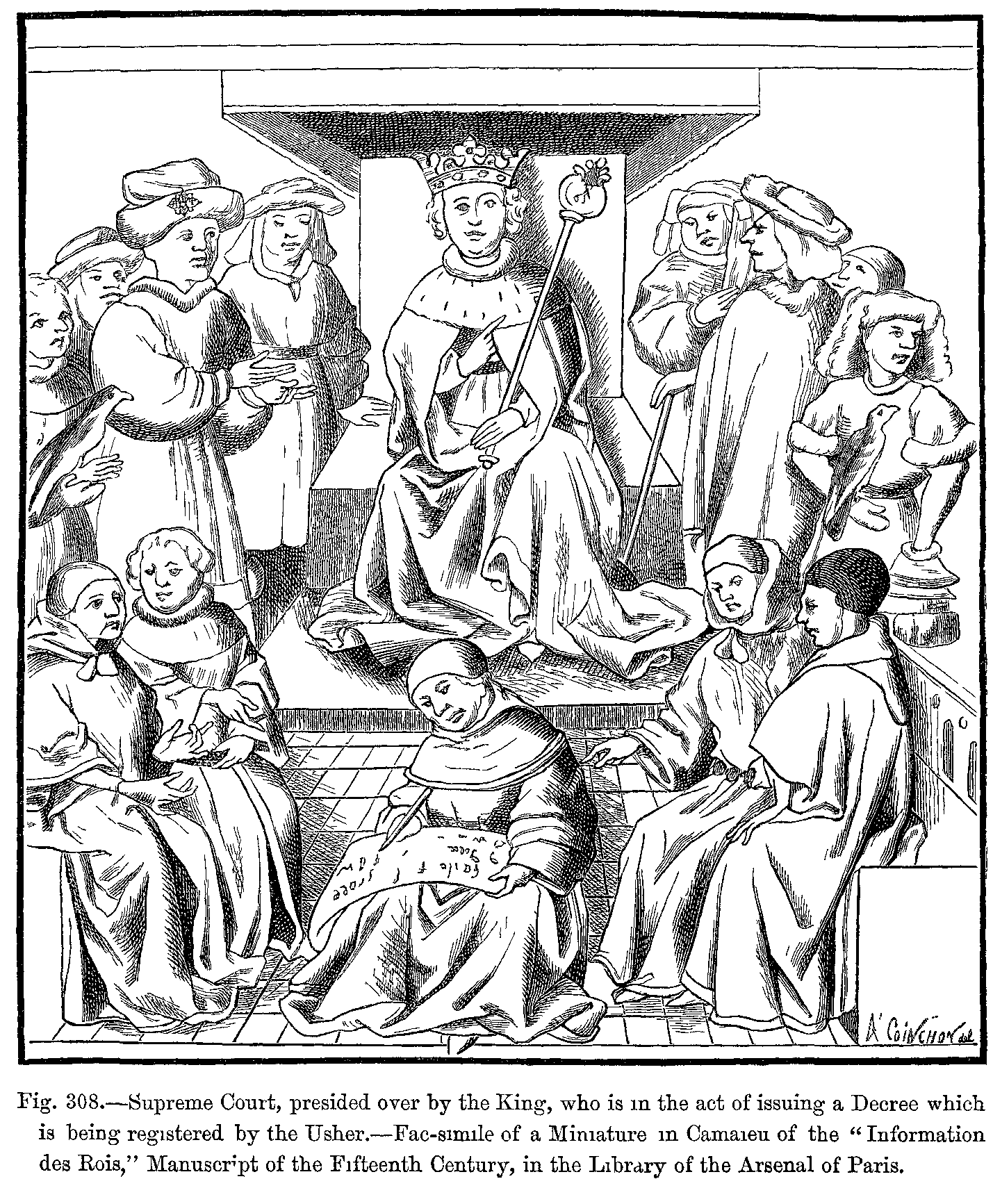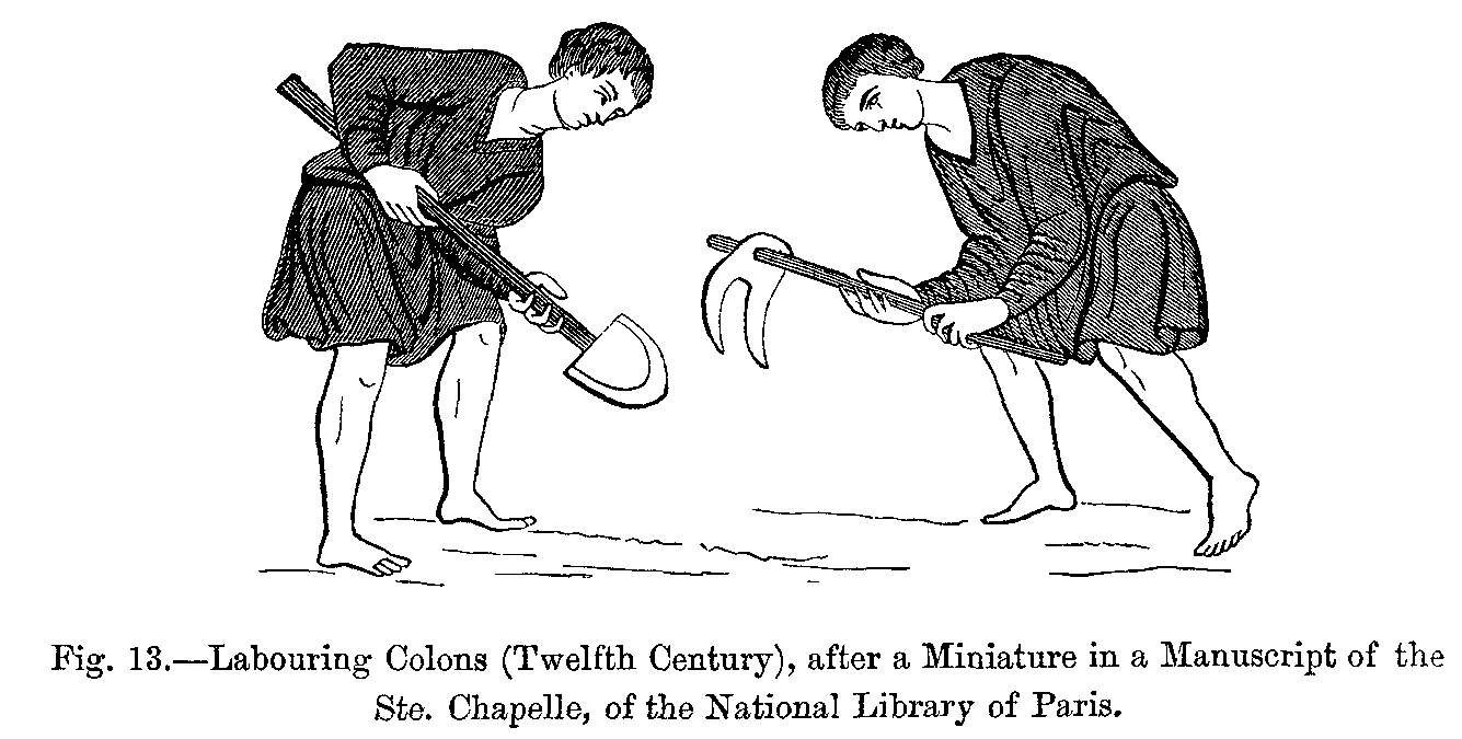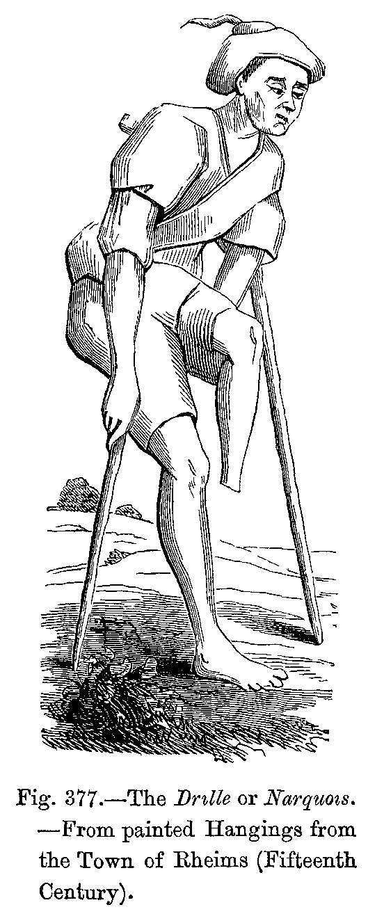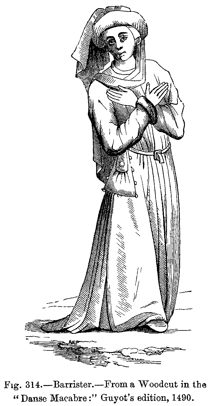 Before proceeding further in our history of mediæval dress, we must forestall a remark which will not fail to be made by the reader, and this is, that we seem to occupy ourselves exclusively with the dress of kings, queens, and other people of note. But we must reply, that though we are able to form tolerably accurate notions relative to the dress of the upper classes during these remote periods, we do not possess any reliable information relative to that of the lower orders, and that the written documents, as well as the sculptures and paintings, are almost useless on this point. Nevertheless, we may suppose that the dress of the men in the lowest ranks of society has always been short and tight, consisting of braies, or tight drawers, mostly made of leather, of tight tunics, of sayons or doublets, and of capes or cloaks of coarse brown woollen. The tunic was confined at the waist by a belt, to which the knife, the purse, and sometimes the working tools were suspended. The head-dress of the people was generally a simple cap made of thick, coarse woollen cloth or felt, and often of sheep's skin. During the twelfth century, a person's rank or social position was determined by the head-dress. The cap was made of velvet for persons of rank, and of common cloth for the poor. The cornette, which was always an appendage to the cap, was made of cloth, with which the cap might be fastened or adjusted on the head. The mortier, or round cap, dates from the earliest centuries, and was altered both in shape and material according to the various changes of fashion; but lawyers of high position continued to wear it almost in its original shape, and it became like a professional badge for judges and advocates.