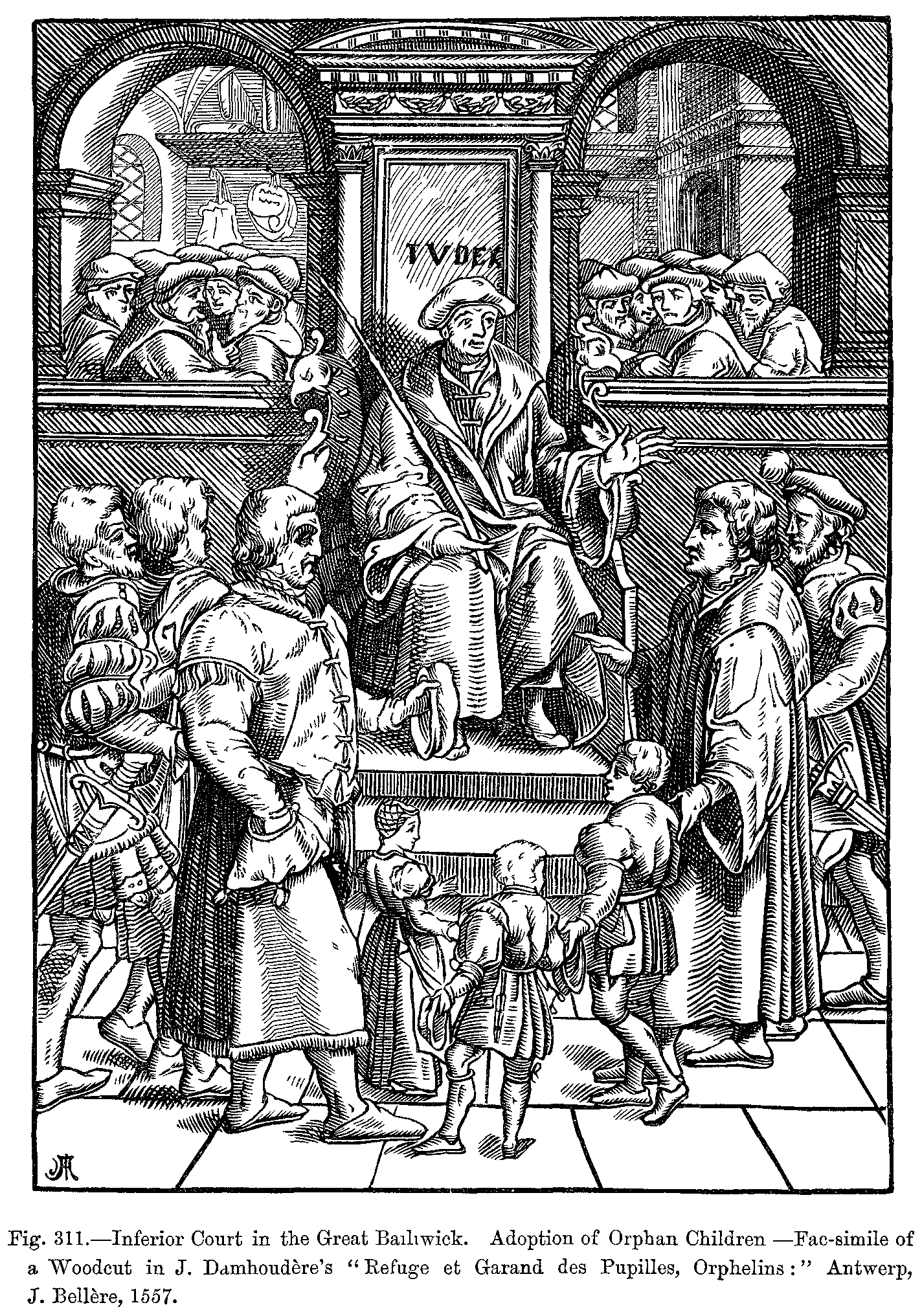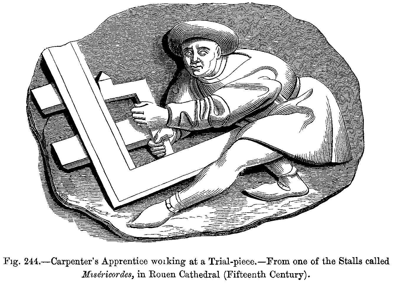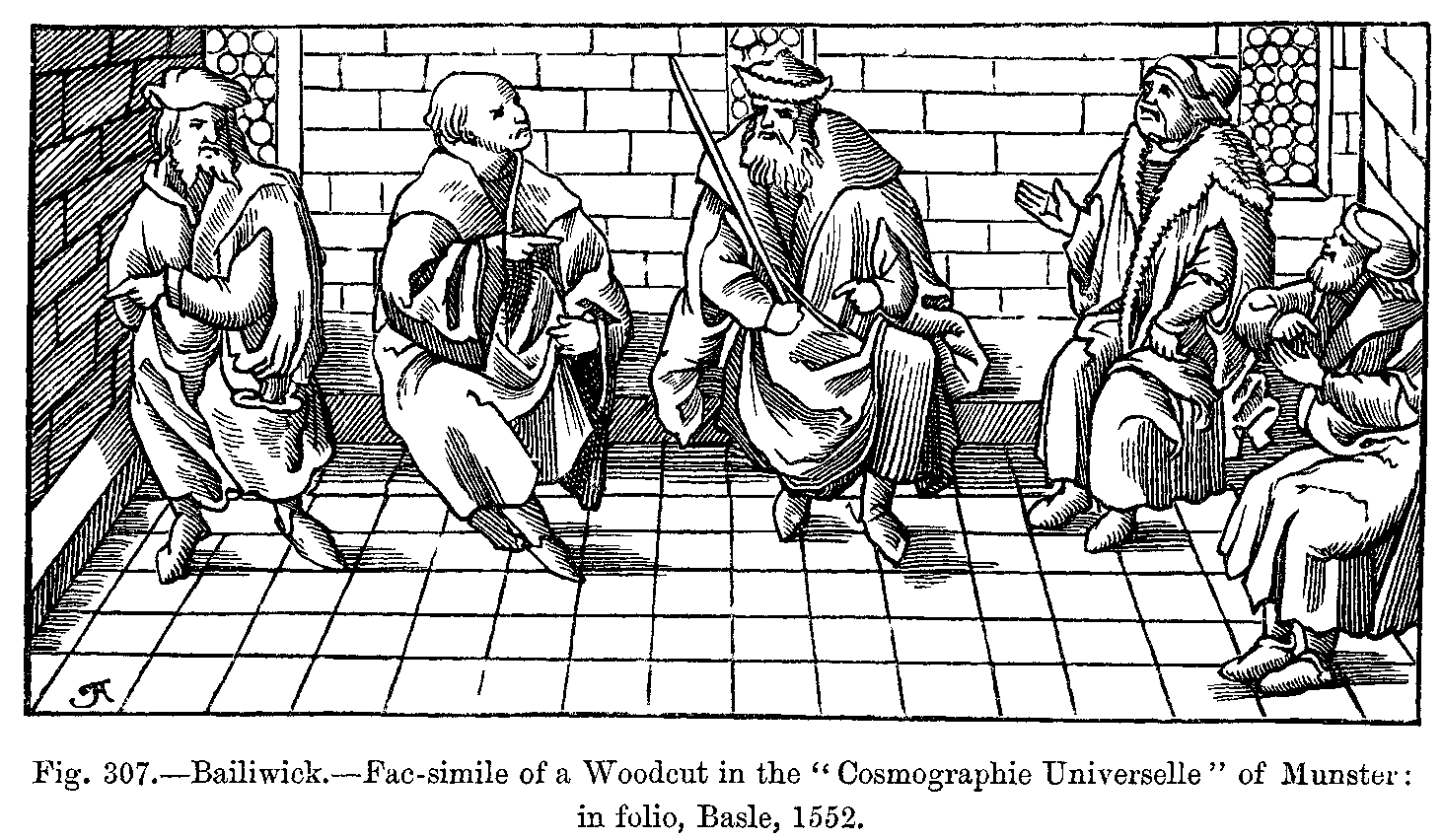 Before proceeding further in our history of mediæval dress, we must forestall a remark which will not fail to be made by the reader, and this is, that we seem to occupy ourselves exclusively with the dress of kings, queens, and other people of note. But we must reply, that though we are able to form tolerably accurate notions relative to the dress of the upper classes during these remote periods, we do not possess any reliable information relative to that of the lower orders, and that the written documents, as well as the sculptures and paintings, are almost useless on this point. Nevertheless, we may suppose that the dress of the men in the lowest ranks of society has always been short and tight, consisting of braies, or tight drawers, mostly made of leather, of tight tunics, of sayons or doublets, and of capes or cloaks of coarse brown woollen. The tunic was confined at the waist by a belt, to which the knife, the purse, and sometimes the working tools were suspended. The head-dress of the people was generally a simple cap made of thick, coarse woollen cloth or felt, and often of sheep's skin. During the twelfth century, a person's rank or social position was determined by the head-dress. The cap was made of velvet for persons of rank, and of common cloth for the poor. The cornette, which was always an appendage to the cap, was made of cloth, with which the cap might be fastened or adjusted on the head. The mortier, or round cap, dates from the earliest centuries, and was altered both in shape and material according to the various changes of fashion; but lawyers of high position continued to wear it almost in its original shape, and it became like a professional badge for judges and advocates.
