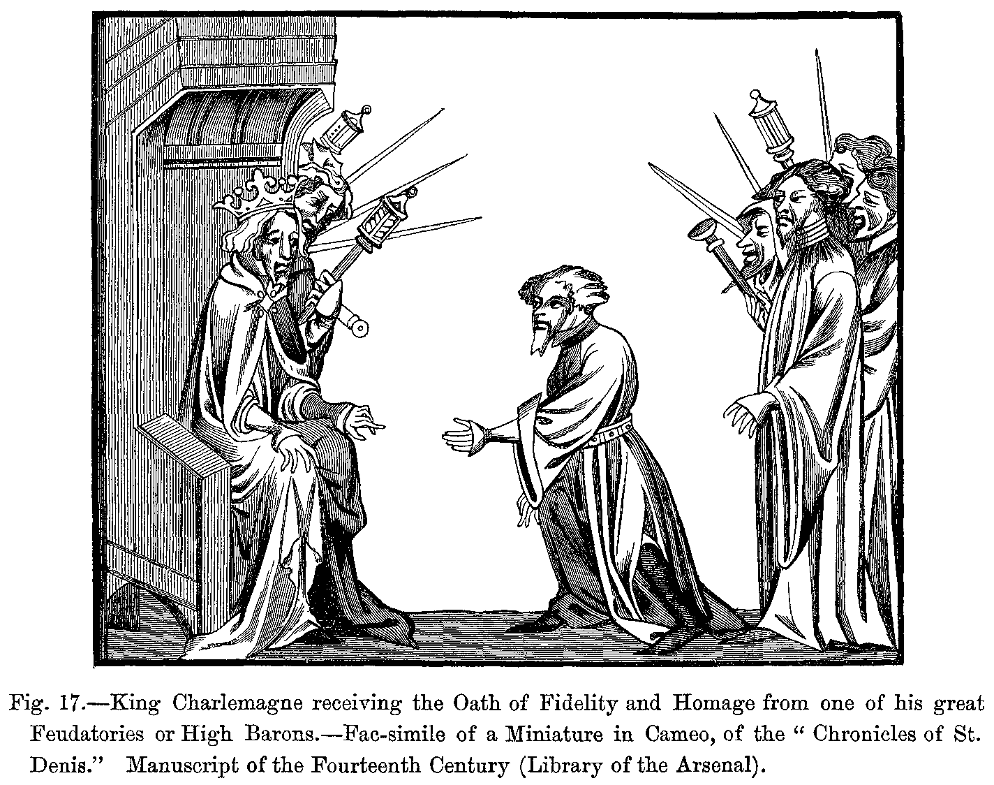 In a high order of ideas, what great facts serve as a foundation to our history and that of the modern world! We have first royalty, which, weak and debased under the Merovingians, rises and establishes itself energetically under Pépin and Charlemagne, to degenerate under Louis le Débonnaire and Charles le Chauve. After having dared a second time to found the Empire of the Caesars, it quickly sees its sovereignty replaced by feudal rights, and all its rights usurped by the nobles, and has to struggle for many centuries to recover its rights one by one.