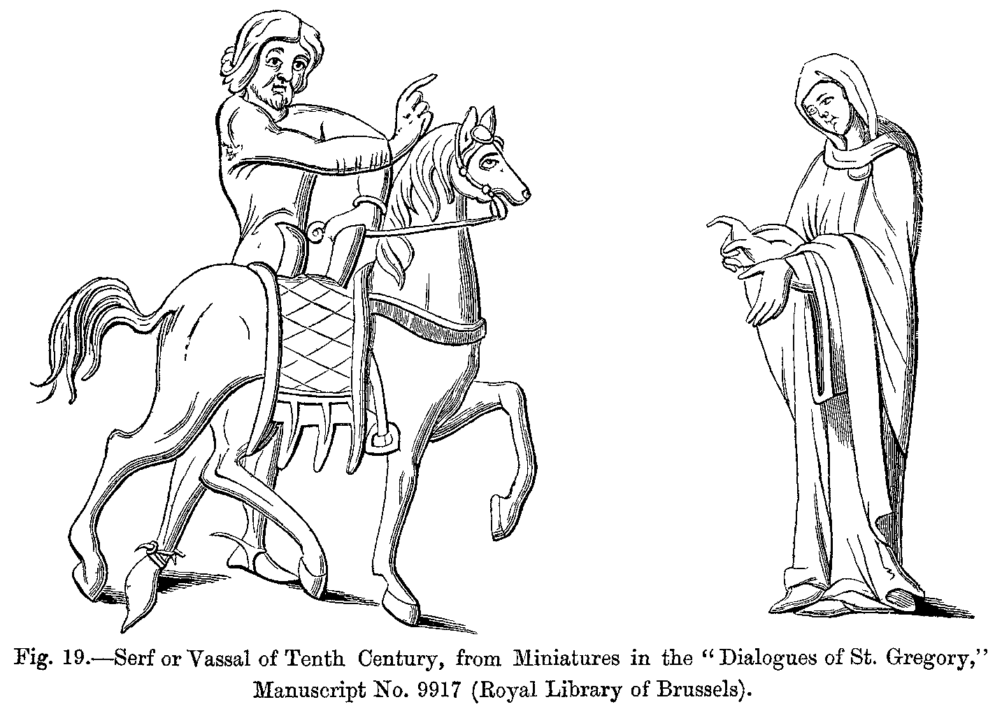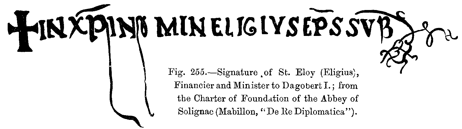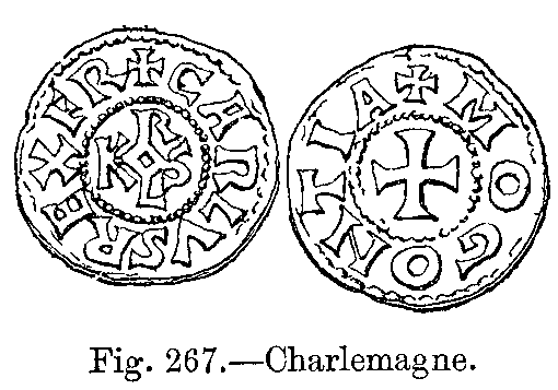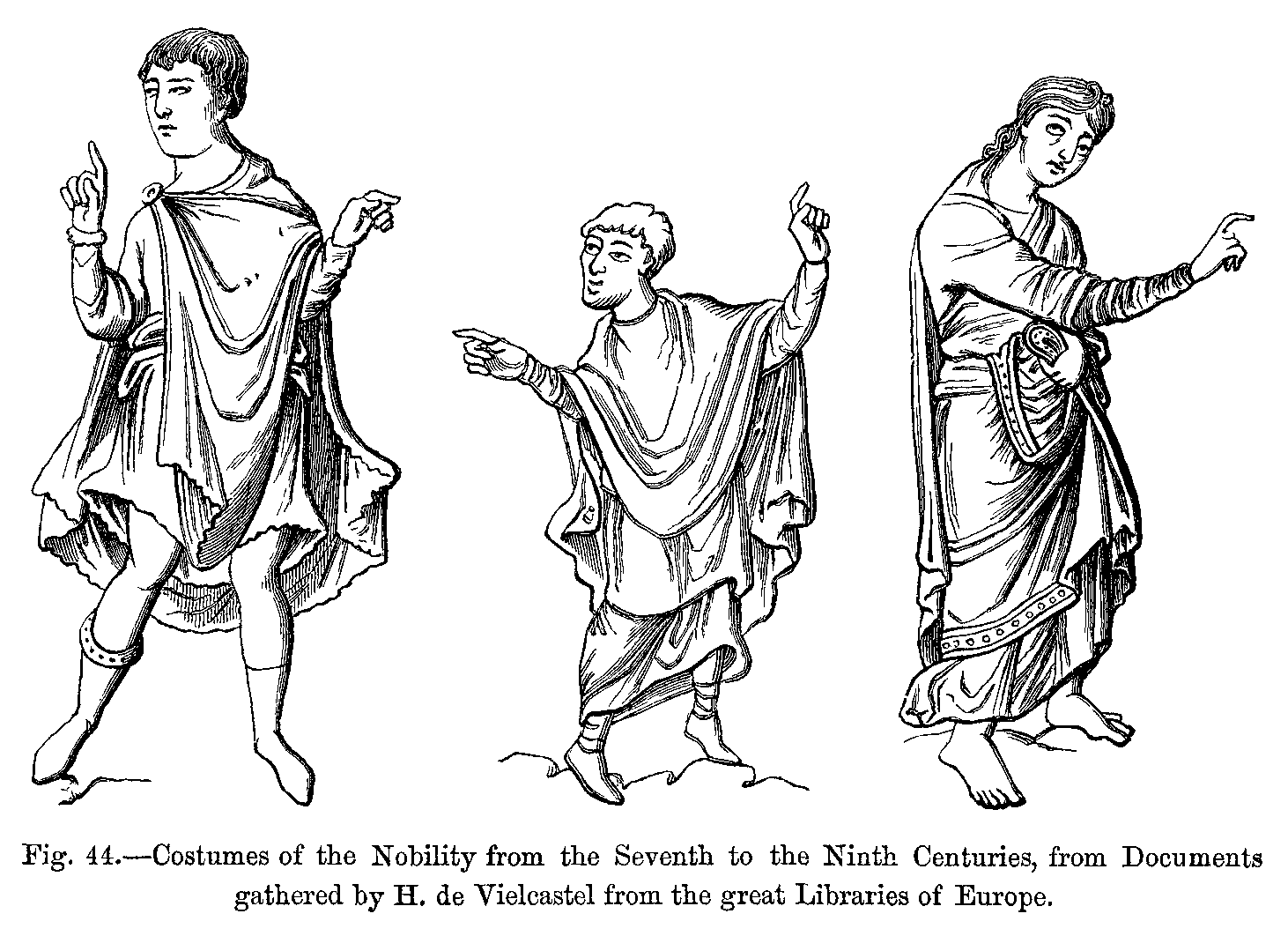 During the reign of the other Carlovingian kings, in the midst of political troubles, of internal wars, and of social disturbances, they had neither time nor inclination for inventing new fashions. Monuments of the latter part of the ninth century prove, indeed, that the national dress had hardly undergone any change since the time of Charlemagne, and that the influence of Roman tradition, especially on festive occasions, was still felt in the dress of the nobles (Figs. 408 to 411).