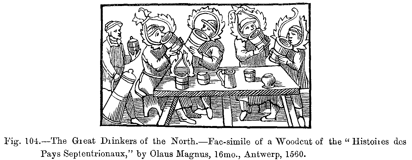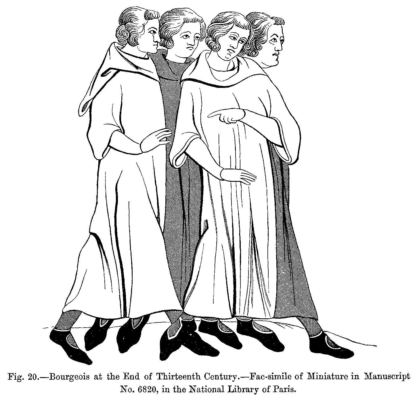 With the aid of our learned guide we have now reached a period (end of the thirteenth century) well adapted for this general study of the dress of our ancestors, inasmuch as soon afterwards men's dress at least, and especially that of young courtiers, became most ridiculously and even indecently exaggerated. To such an extent was this the case, that serious calamities having befallen the French nation about this time, and its fashions having exercised a considerable influence over the whole continent of Europe, contemporary historians do not hesitate to regard these public misfortunes as a providential chastisement inflicted on France for its disgraceful extravagance in dress.