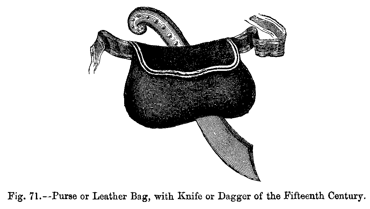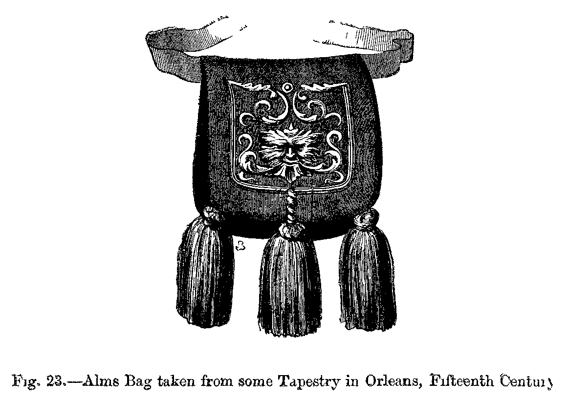 The Crusades also gave rise to the general use of the purse, which was suspended to the belt by a cord of silk or cotton, and sometimes by a metal chain. At the time of the Holy War, it had become an emblem characteristic of pilgrims, who, before starting for Palestine, received from the hands of the priest the cross, the pilgrim's staff, and the purse.