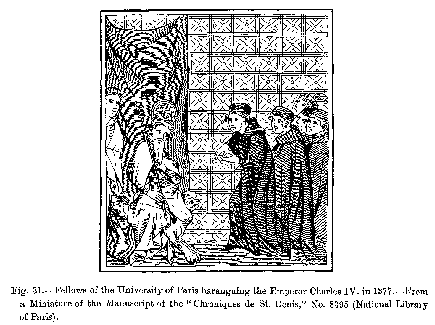Influence of Ancient Costume.--Costume in the Fifteenth Century.--Hair.--Costumes in the Time of Charlemagne.--Origin of Modern National Dress.--Head-dresses and Beards: Time of St. Louis.--Progress of Dress: Trousers, Hose, Shoes, Coats, Surcoats, Capes.--Changes in the Fashions of Shoes and Hoods.--Livrée.--Cloaks and Capes.--Edicts against Extravagant Fashions.--Female Dress: Gowns, Bonnets, Head-dresses, &c.--Disappearance of Ancient Dress.--Tight-fitting Gowns.--General Character of Dress under Francis I.--Uniformity of Dress.