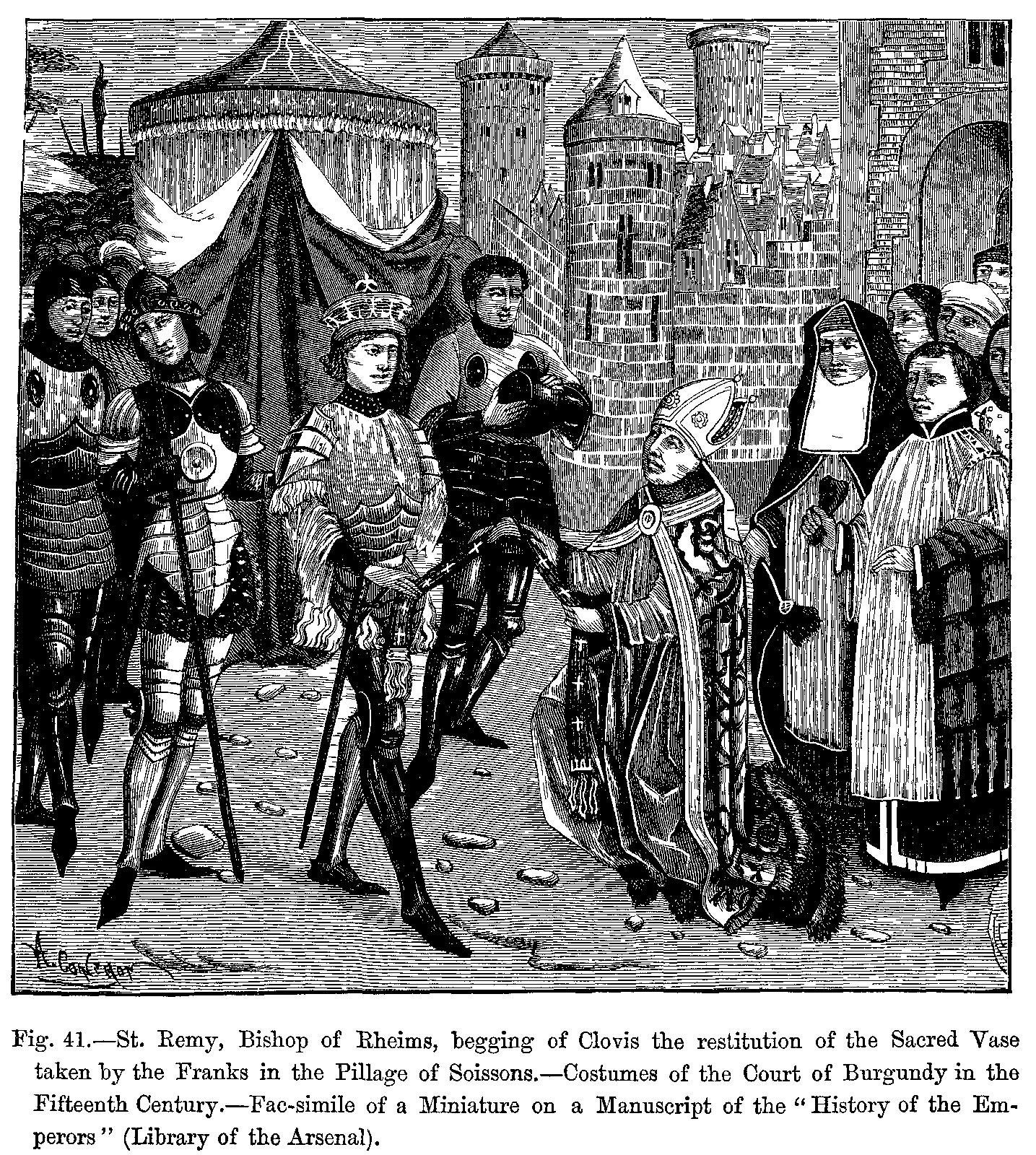 1. The Queen of Sheba before Solomon. Fac-simile of a Miniature from the Breviary of Cardinal Grimani, attributed to Memling. Costumes of the Fifteenth Century.