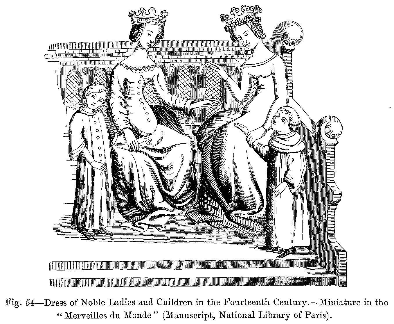 If we now turn to female attire, we shall find represented in it all the component parts of male dress, and almost all of them under the same names. It must be remarked, however, that the women's coats and surcoats often trailed on the ground; that the hat--which was generally called a couvre-chef, and consisted of a frame of wirework covered over with stuff which was embroidered or trimmed with lace--was not of a conical shape; and, lastly, that the chaperon, which was always made with a tippet, or chausse, never turned over so as to form a cap. We may add that the use of the couvre-chef did not continue beyond the middle of the fourteenth century, at which time women adopted the custom of wearing any kind of head-dress they chose, the hair being kept back by a silken net, or crépine, attached either to a frontlet, or to a metal fillet, or confined by a veil of very light material, called a mollequin (Fig. 420).