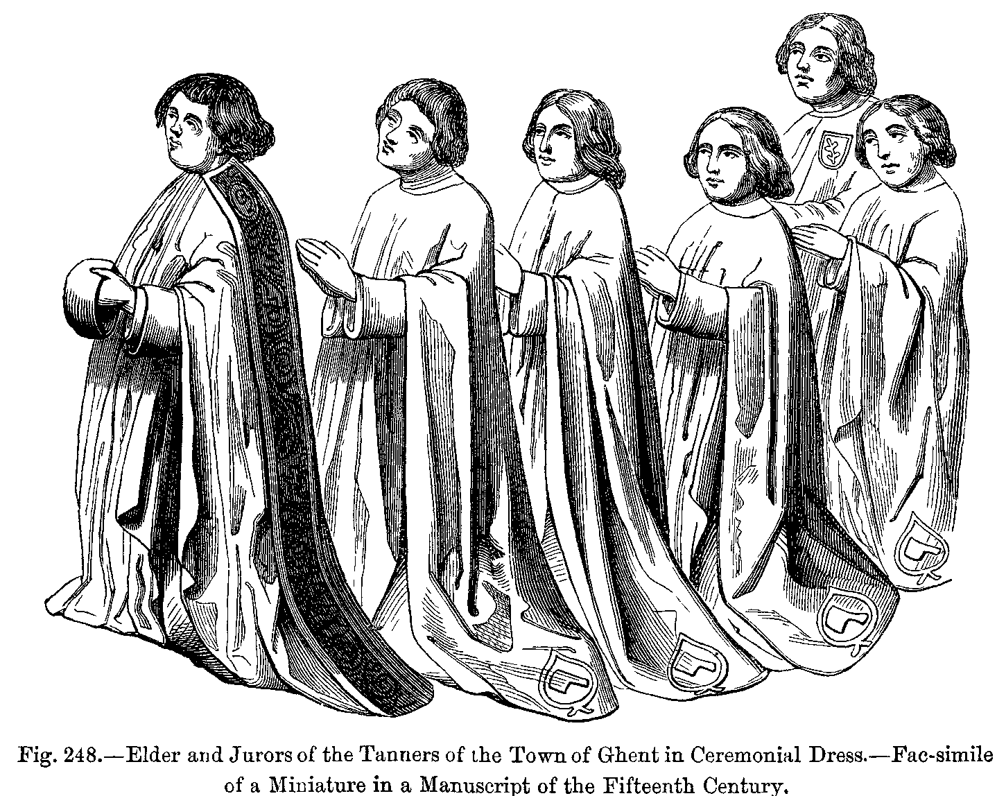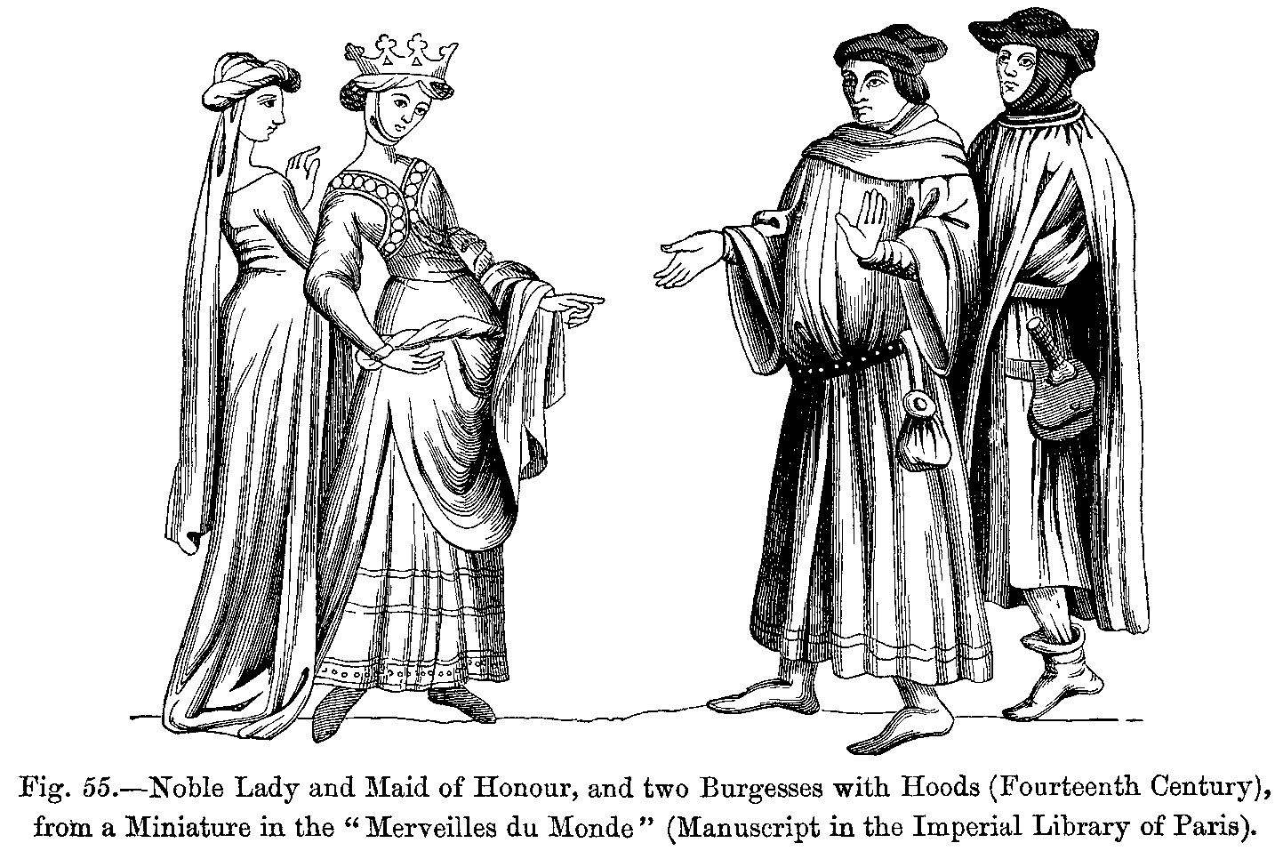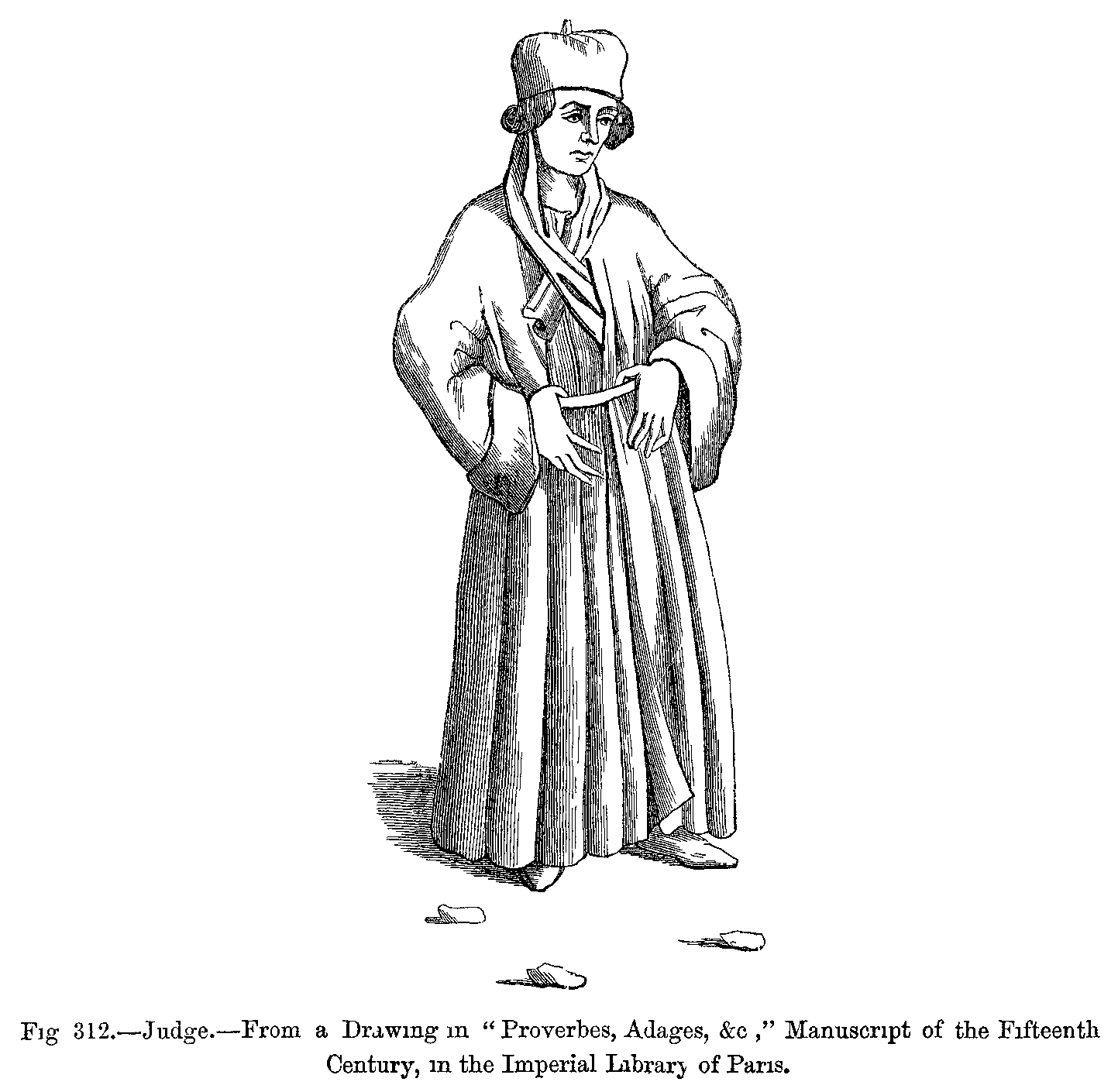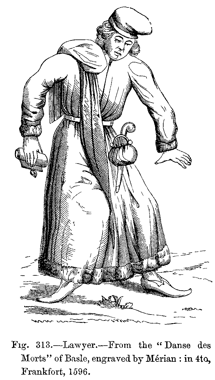 "There were two kinds of mantles; one was open in front, and fell over the back, and a strap which crossed the chest held it fixed on the shoulders; the other, enveloping the body like a bell, was slit up on the right side, and was thrown back over the left arm; it was made with a fur collar, cut in the shape of a tippet. This last has been handed down to us, and is worn by our judges under the name of toge and épitoge.