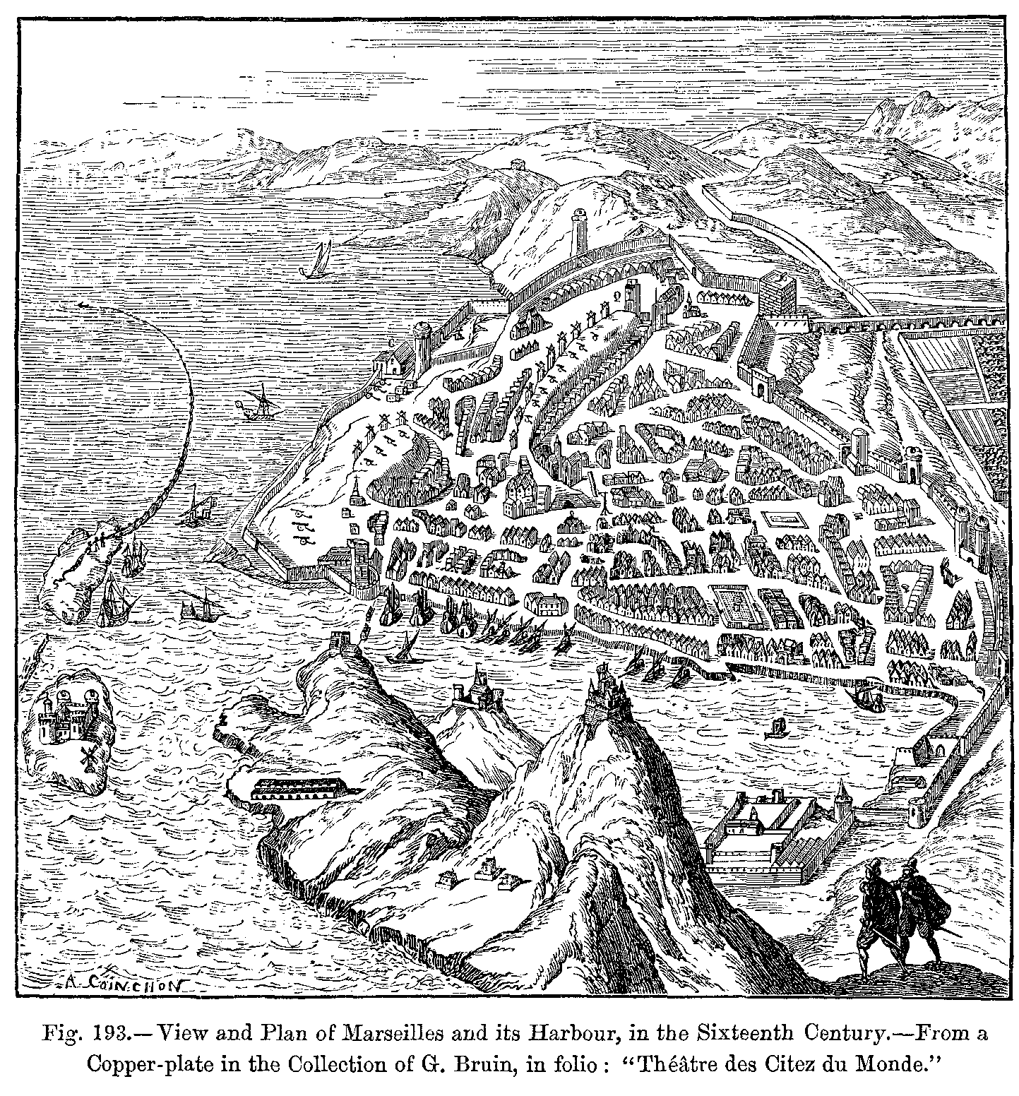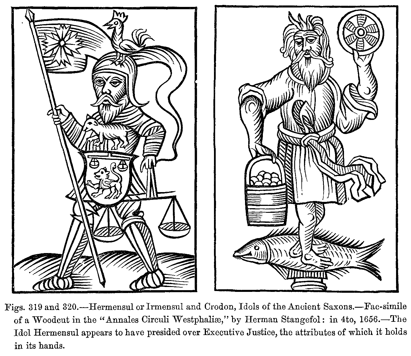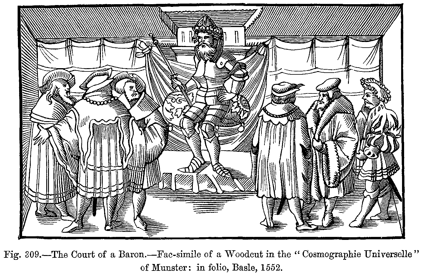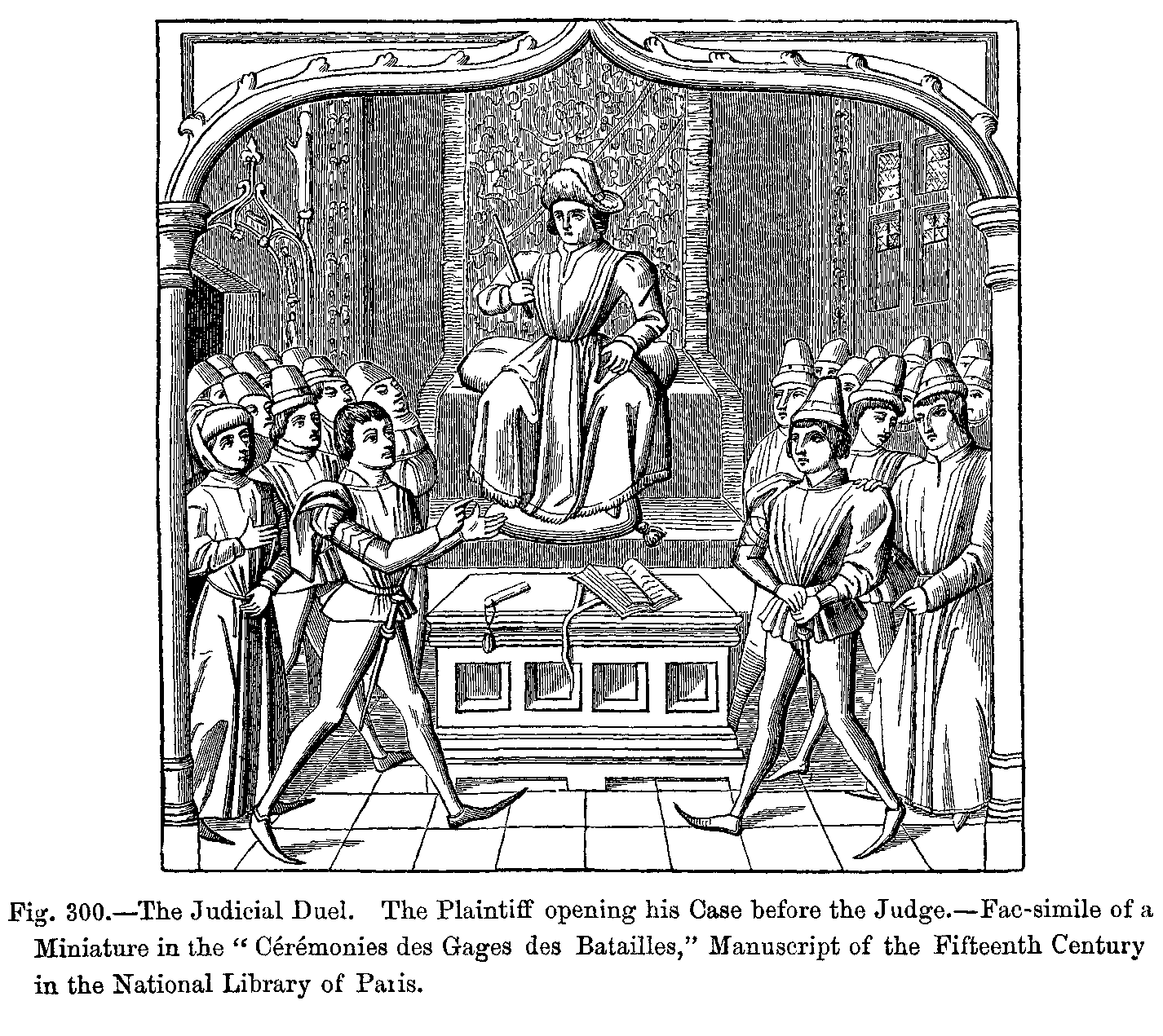 "There were two kinds of mantles; one was open in front, and fell over the back, and a strap which crossed the chest held it fixed on the shoulders; the other, enveloping the body like a bell, was slit up on the right side, and was thrown back over the left arm; it was made with a fur collar, cut in the shape of a tippet. This last has been handed down to us, and is worn by our judges under the name of toge and épitoge.