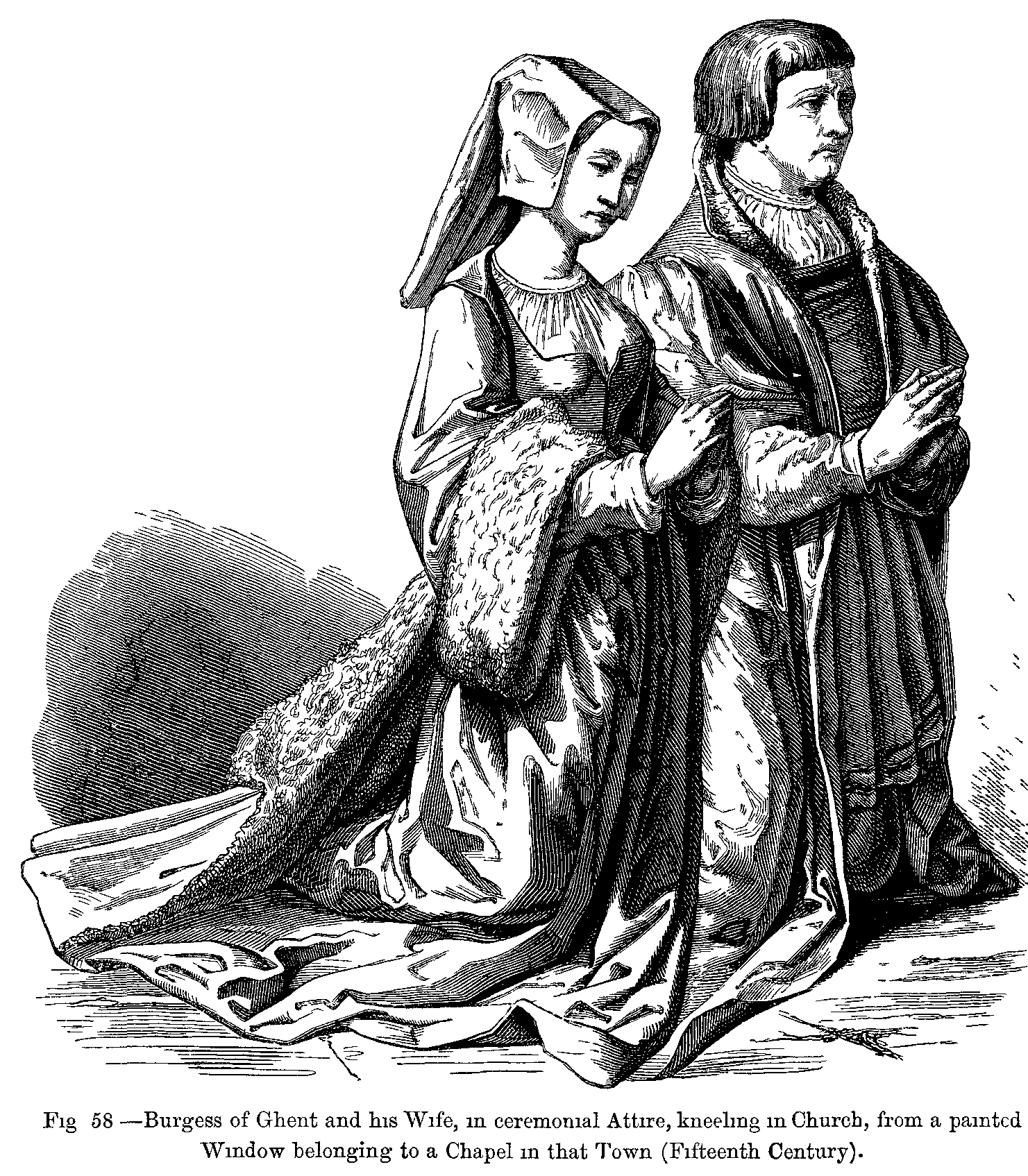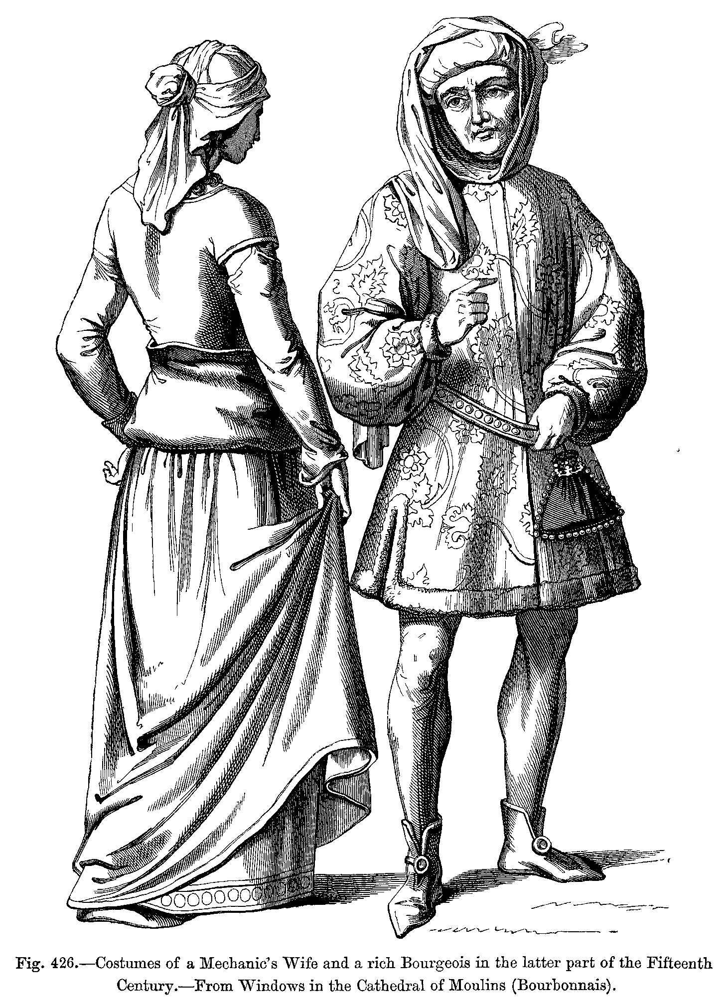 Fig. 426.--Costumes of a Mechanic's Wife and a rich Bourgeois in the latter part of the Fifteenth Century.--From Windows in the Cathedral of Moulins (Bourbonnais).