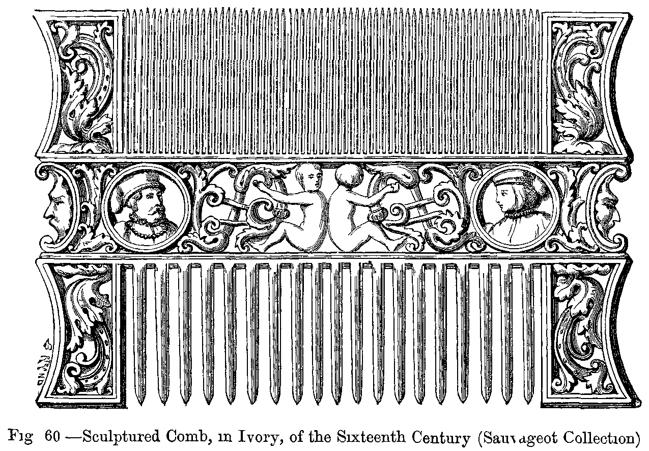 Whilst persons of rank were distinguished by their long and flowing hair, the people wore theirs more or less short, according to the degree of freedom which they possessed, and the serfs had their heads completely shaved. It was customary for the noble and free classes to swear by their hair, and it was considered the height of politeness to pull out a hair and present it to a person. Frédégaire, the chronicler, relates that Clovis thus pulled out a hair in order to do honour to St. Germer, Bishop of Toulouse, and presented it to him; upon this, the courtiers hastened to imitate their sovereign, and the venerable prelate returned home with his hand full of hair, delighted at the flattering reception he had met with at the court of the Frankish king. Durinig the Merovingian period, the greatest insult that could be offered to a freeman was to touch him with a razor or scissors. The degradation of kings and princes was carried out in a public manner by shaving their heads and sending them into a monastery; on their regaining their rights and their authority, their hair was always allowed to grow again. We may also conclude that great importance was attached to the preservation of the hair even under the kings of the second dynasty, for Charlemagne, in his Capitulaires, orders the hair to be removed as a punishment in certain crimes.
