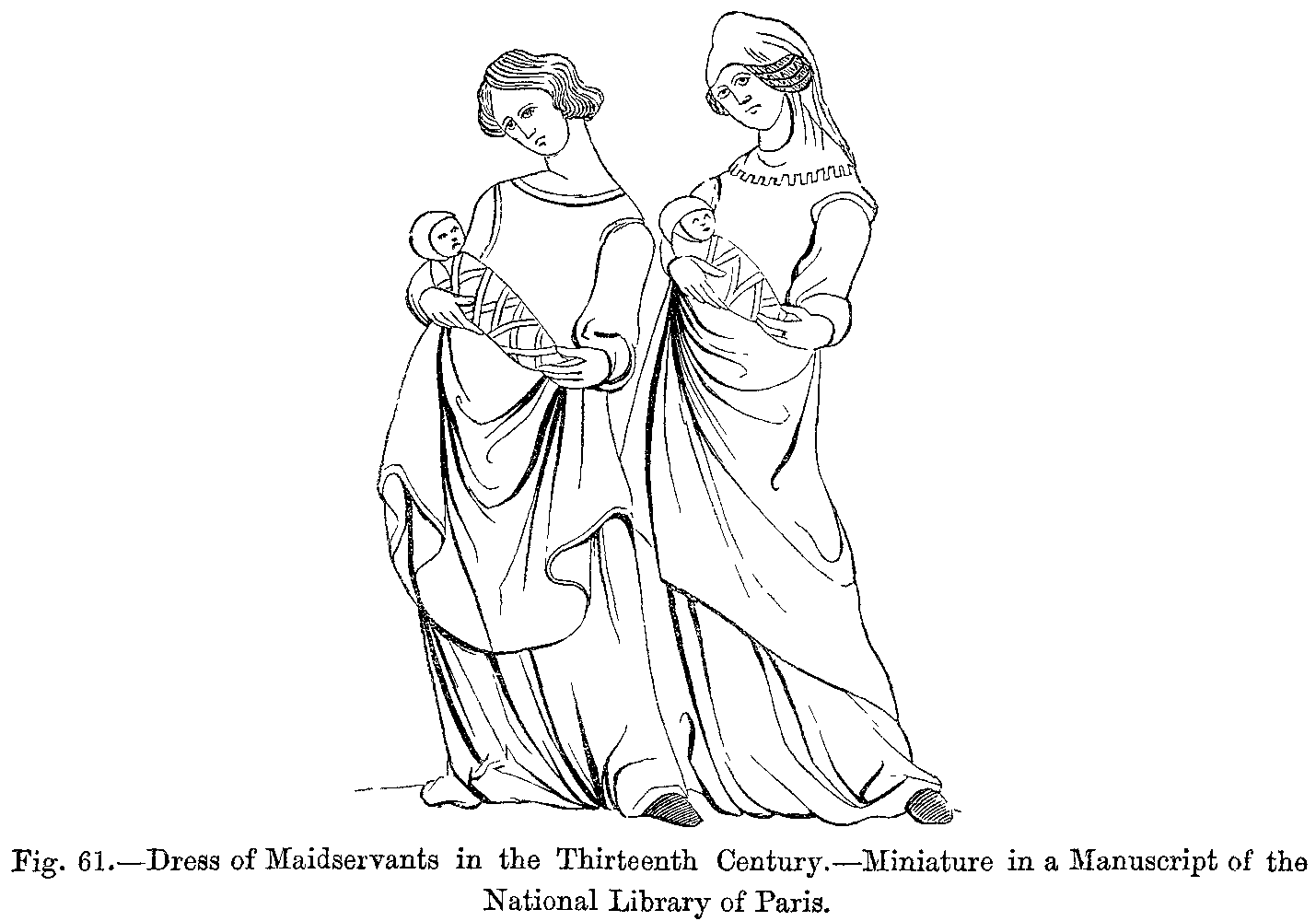 No great change was made in the dress of the two sexes during the tenth century. "Nothing was more simple than the head-dress of women," says M. Jules Quicherat; "nothing was less studied than their mode of wearing their hair; nothing was more simple, and yet finer, than their linen. The elegant appearance of their garments recalls that of the Greek and Roman, women. Their dresses were at times so tight as to display all the elegance of their form, whilst at others they were made so high as completely to cover the neck; the latter were called cottes-hardies. The cotte-hardie, which has at all times been part of the dress of French women, and which was frequently worn also by men, was a long tunic reaching to the heels, fastened in at the waist and closed at the wrists. Queens, princesses, and ladies of the nobility wore in addition a long cloak lined with ermine, or a tunic with or without sleeves; often, too, their dress consisted of two tunics, and of a veil or drapery, which was thrown over the head and fell down before and behind, thus entirely surrounding the neck."