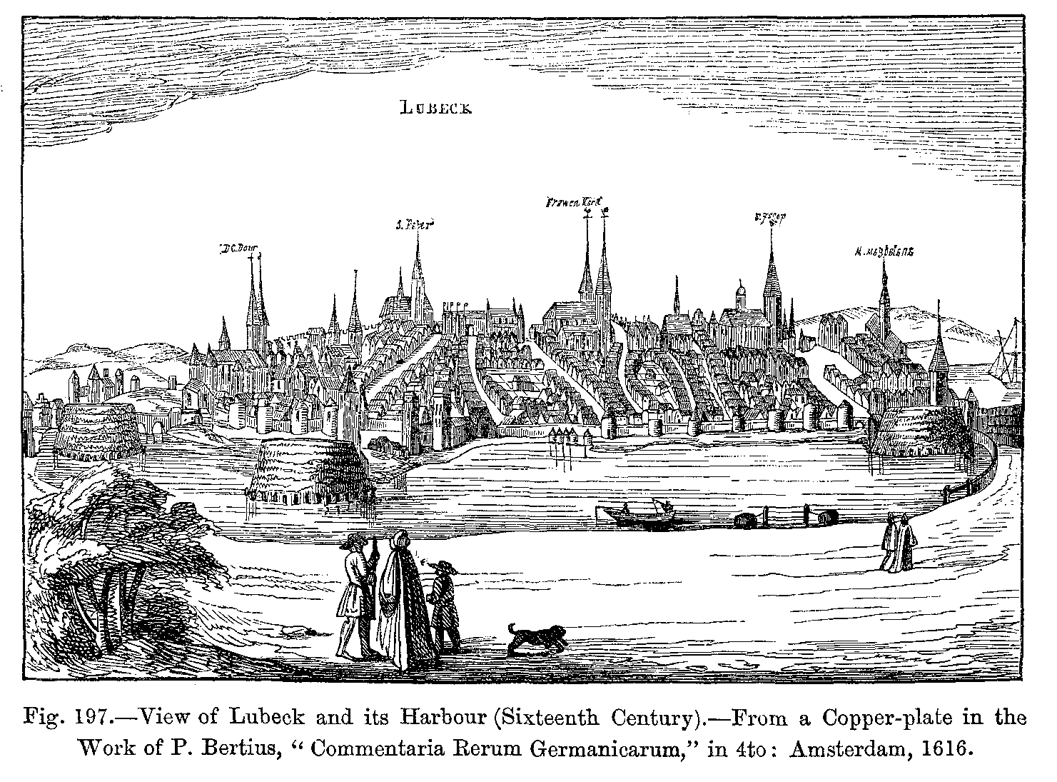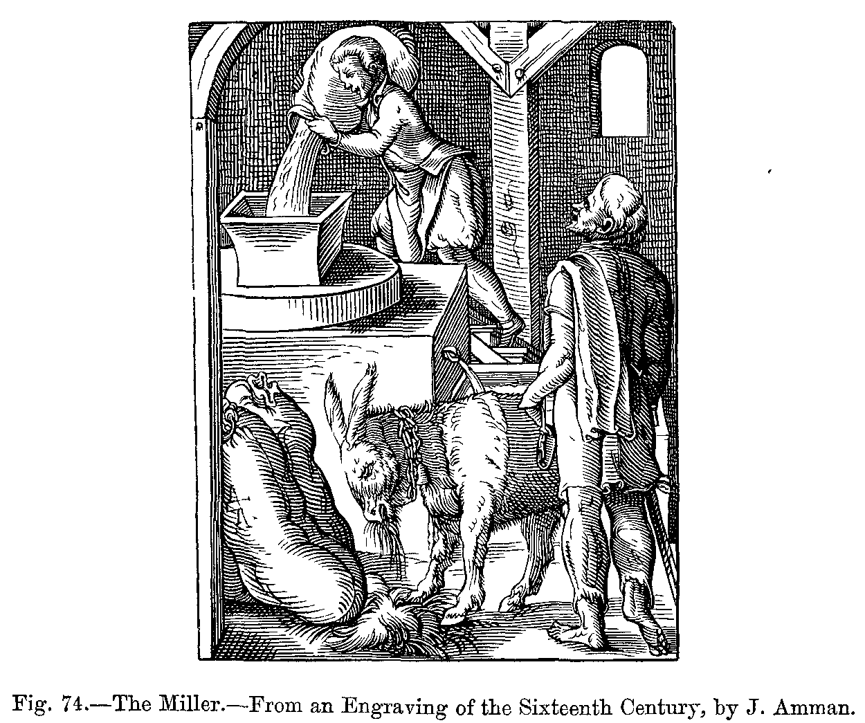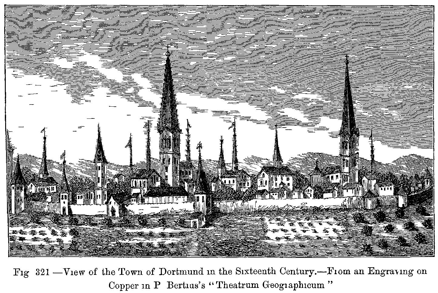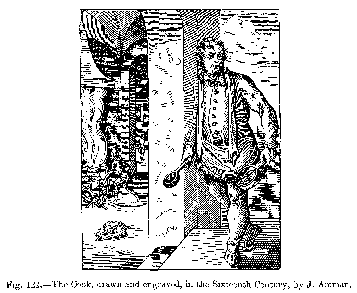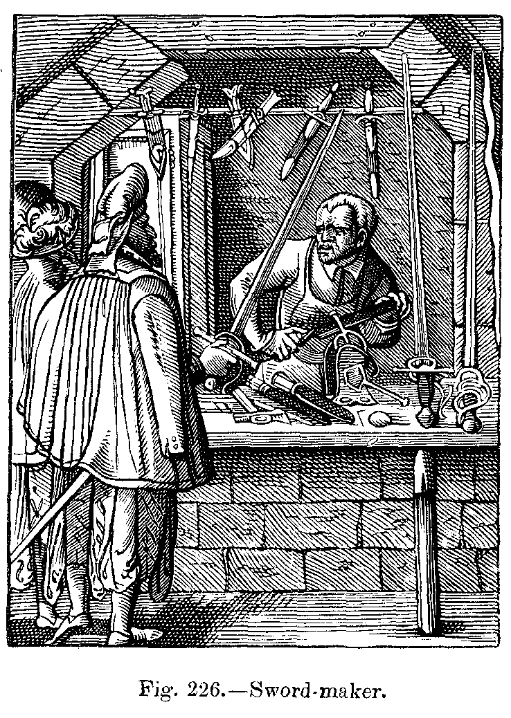 During the sixteenth century, ladies wore the skirts of their dresses, which were tight at the waist and open in front, very wide, displaying the lower part of a very rich under petticoat, which reached to the ground, completely concealing the feet. This, like the sleeves with puffs, which fell in circles to the wrists, was altogether an Italian fashion. Frequently the hair was turned over in rolls, and adorned with precious stones, and was surmounted by a small cap, coquettishly placed either on one side or on the top of the head, and ornamented with gold chains, jewels, and feathers. The body of the dress was always long, and pointed in front. Men wore their coats cut somewhat after the same shape: their trunk hose were tight, but round the waist they were puffed out. They wore a cloak, which only reached as far as the hips, and was always much ornamented; they carried a smooth or ribbed cap on one side of the head, and a small upright collar adorned the coat. This collar was replaced, after the first half of the sixteenth century, by the high, starched ruff, which was kept out by wires; ladies wore it still larger, when it had somewhat the appearance of an open fan at the back of the neck.
