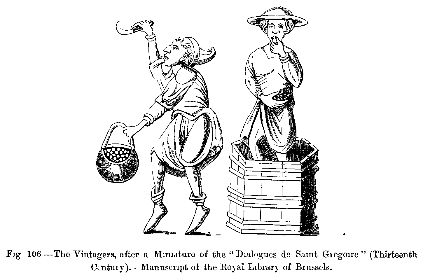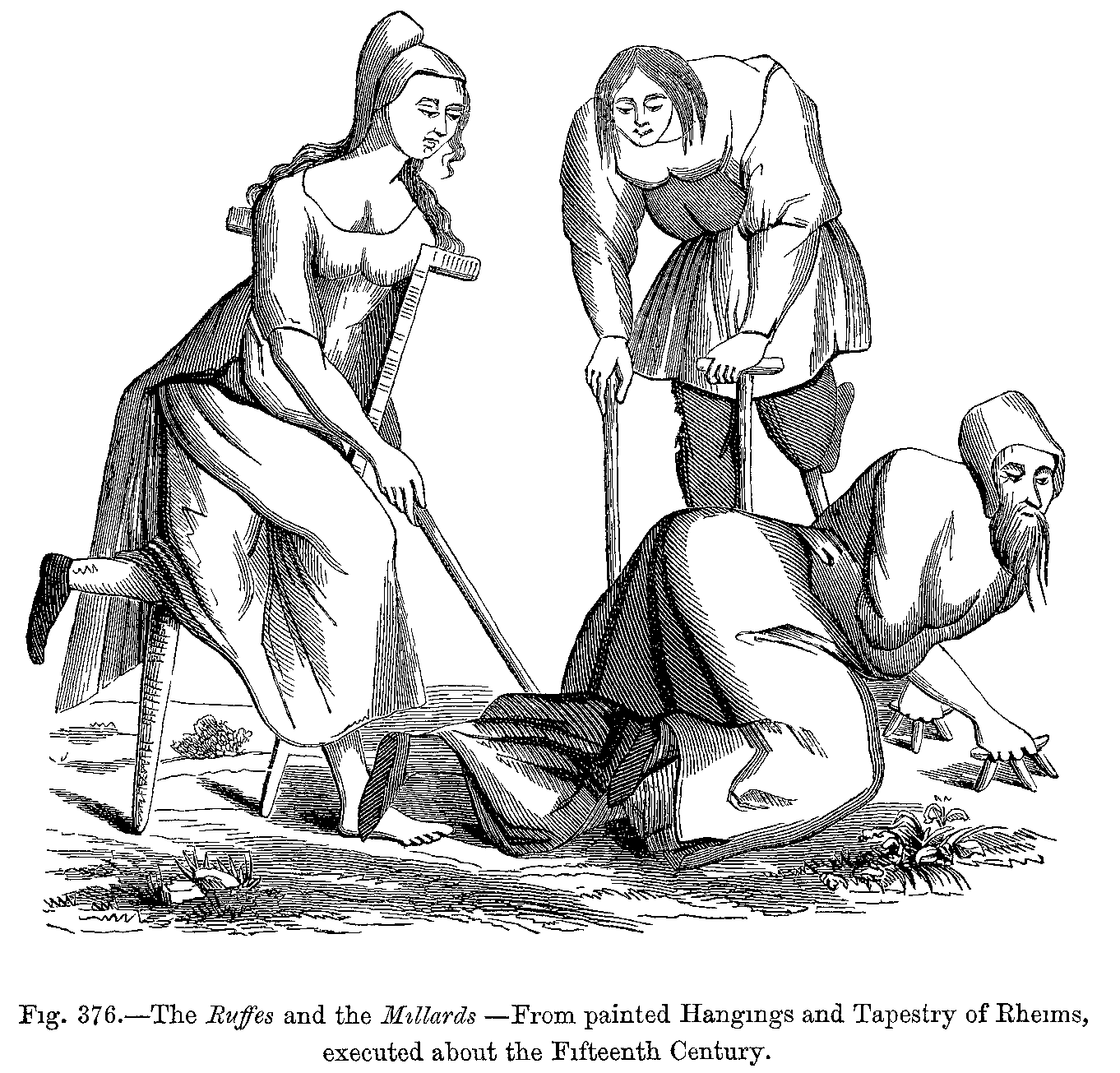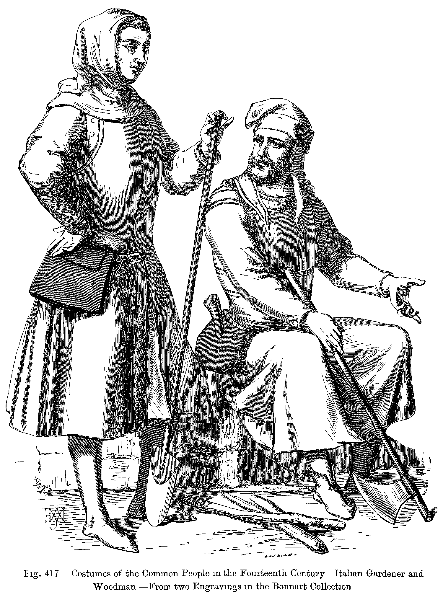 Fig. 417.--Costumes of the Common People in the Fourteenth Century: Italian Gardener and Woodman.--From two Engravings in the Bonnart Collection.
