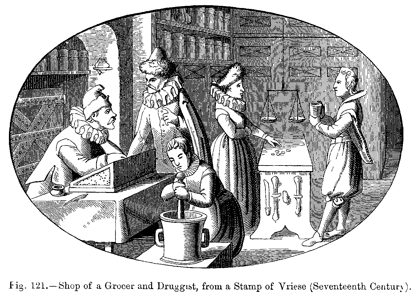 Catherine de Medicis had introduced into France the fashion of ruffs, and at the beginning of the fourteenth century, Marie de Medicis that of small collars. Dresses tight at the waist began to be made very full round the hips, by means of large padded rolls, and these were still more enlarged, under the name of vertugadins (corrupted from vertu-gardiens), by a monstrous arrangement of padded whalebone and steel, which subsequently became the ridiculous paniers, which were worn almost down to the commencement of the present century; and the fashion seems likely to come into vogue again.