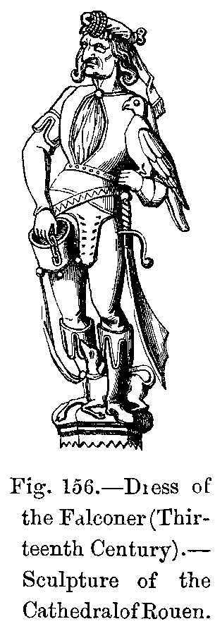 "Towards the year 1280," he says, "the dress of a man--not of a man as the word was then used, which meant serf, but of one to whom the exercise of human prerogatives was permitted, that is to say, of an ecclesiastic, a bourgeois, or a noble--was composed of six indispensable portions: the braies, or breeches, the stockings, the shoes, the coat, the surcoat, or cotte-hardie, and the chaperon, or head-dress. To these articles those who wished to dress more elegantly added, on the body, a shirt; on the shoulders, a mantle; and on the head, a hat, or fronteau.