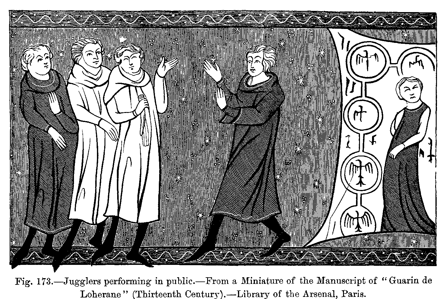 Games of the Ancient Greeks and Romans.--Games of the Circus.--Animal Combats.--Daring of King Pepin.--The King's Lions.--Blind Men's Fights.--Cockneys of Paris.--Champ de Mars.--Cours Plénières and Cours Couronnées.--Jugglers, Tumblers, and Minstrels.--Rope-dancers.--Fireworks.--Gymnastics.--Cards and Dice.--Chess, Marbles, and Billiards.--La Soule, La Pirouette, &c.--Small Games for Private Society.--History of Dancing.--Ballet des Ardents.--The "Orchésographie" (Art of Dancing) of Thoinot Arbeau.--List of Dances.