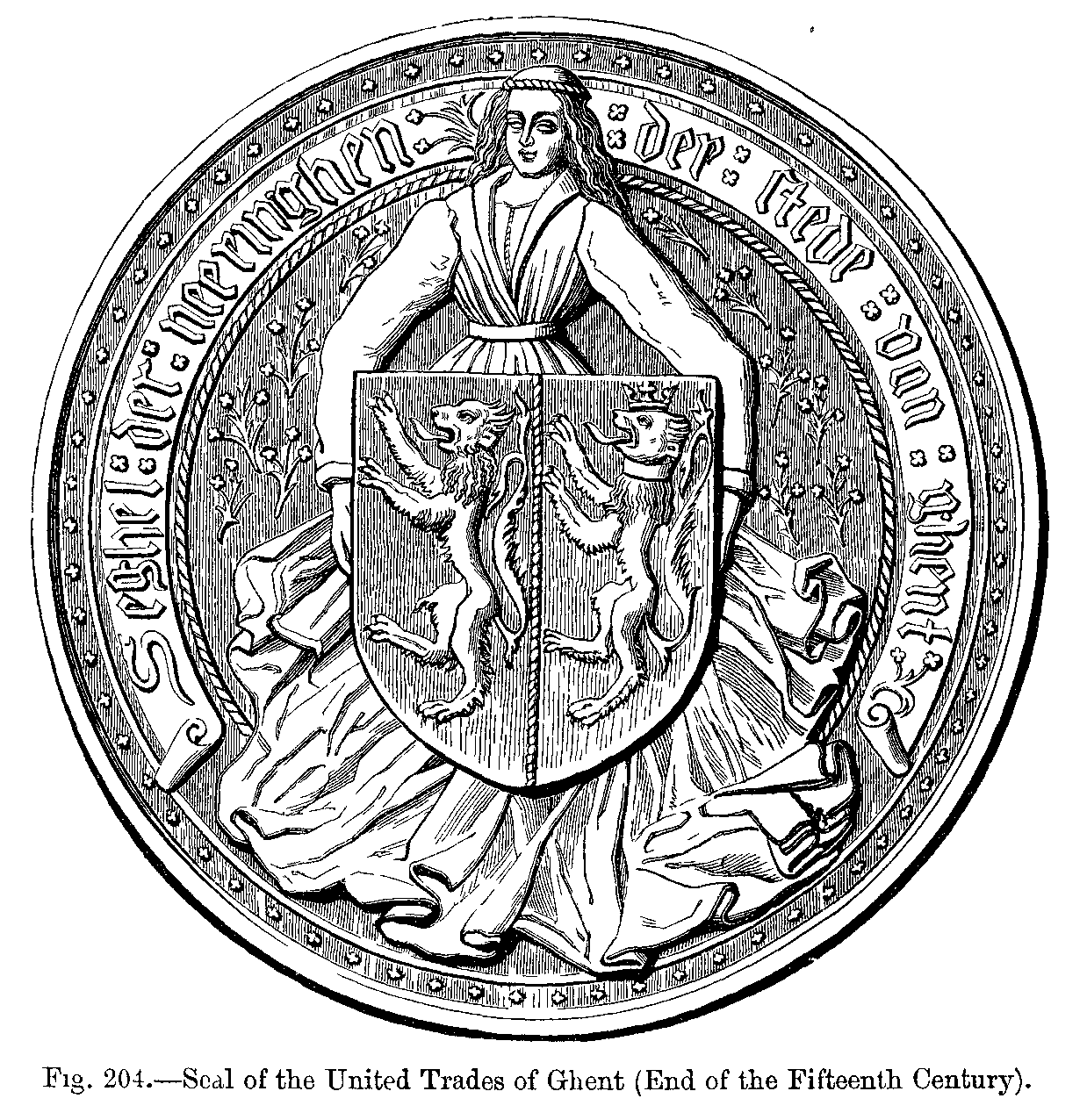 One word more in reference to female head-dress. The fashion of wearing false hair continued in great favour during the middle of the fourteenth century, and it gave rise to all sorts of ingenious combinations; which, however, always admitted of the hair being parted from the forehead to the back of the head in two equal masses, and of being plaited or waved over the ears. Nets were again adopted, and head-dresses which, whilst permitting a display of masses of false hair, hid the horsehair or padded puffs. And, lastly, the escoffion appeared--a heavy roll, which, being placed on a cap also padded, produced the most clumsy, outrageons, and ungraceful shapes (Fig. 424).
