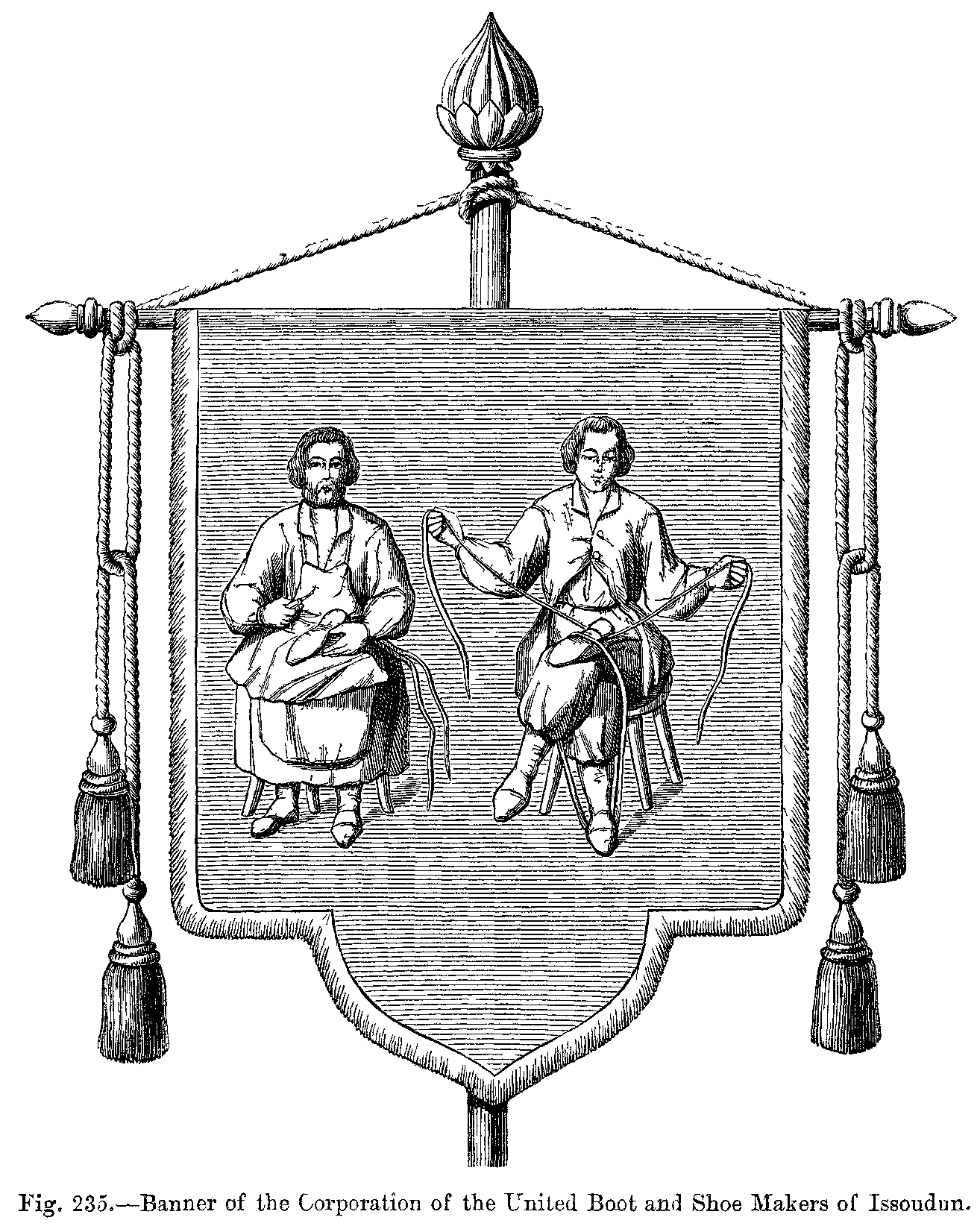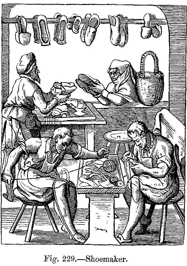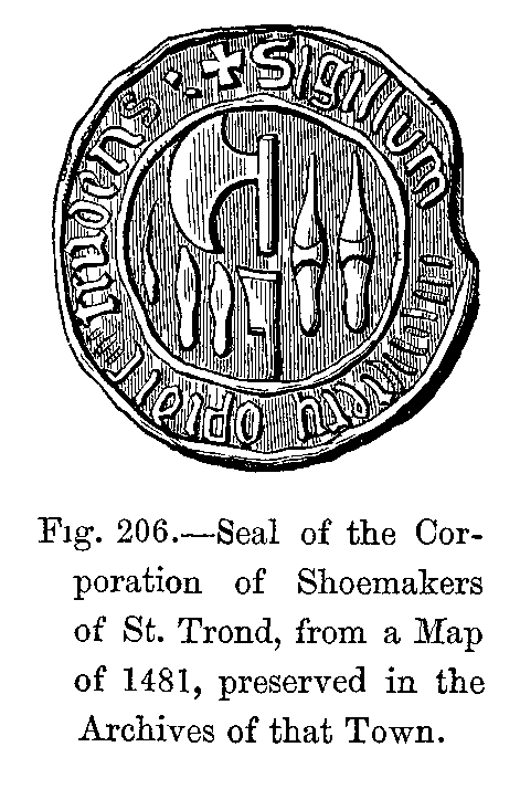 "The shoes were made of various kinds of leather, the quality of which depended on the way in which they were tanned, and were either of common leather, or of leather which was similar to that we know as morocco, and was called cordouan or cordua (hence the derivation of the word cordouannier, which has now become cordonnier). Shoes were generally made pointed; this fashion of the poulaines, or Polish points, was followed throughout the whole of Europe for nearly three hundred years, and, when first introduced, the Church was so scandalized by it that it was almost placed in the catalogue of heresies. Subsequently, the taste respecting the exaggerated length of the points was somewhat modified, but it had become so inveterate that the tendency for pointed shoes returning to their former absurd extremes was constantly showing itself. The pointed shoes became gradually longer during the struggles which were carried on in the reign of Philippe le Bel between Church and State.