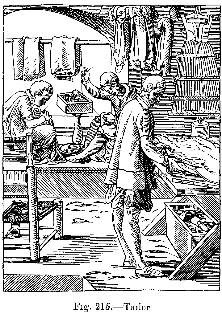 We find that a distinct separation between ancient and modern dress took place as early as the sixteenth century; in fact, our present fashions may be said to have taken their origin from about that time. It was during this century that men adopted clothes closely fitting to the body; overcoats with tight sleeves, felt hats with more or less wide brims, and closed shoes and boots. The women also wore their dresses closely fitting to the figure, with tight sleeves, low-crowned hats, and richly-trimmed petticoats. These garments, which differ altogether from those of antiquity, constitute, as it were, the common type from which have since arisen the endless varieties of male and female dress; and there is no doubt that fashion will thus be continually changing backwards and forwards from time to time, sometimes returning to its original model, and sometimes departing from it.