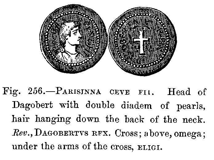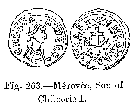 One great and characteristic difference between the Romans and the Franks should, however, be specially mentioned; namely, in the fashion of wearing the hair long, a fashion never adopted by the Romans, and which, during the whole of the first dynasty, was a distinguishing mark of kings and nobles among the Franks. Agathias, the Greek historian, says, "The hair is never cut from the heads of the Frankish kings' sons. From early youth their hair falls gracefully over their shoulders, it is parted on the forehead, and falls equally on both sides; it is with them a matter to which they give special attention." We are told, besides, that they sprinkled it with gold-dust, and plaited it in small bands, which they ornamented with pearls and precious metals.