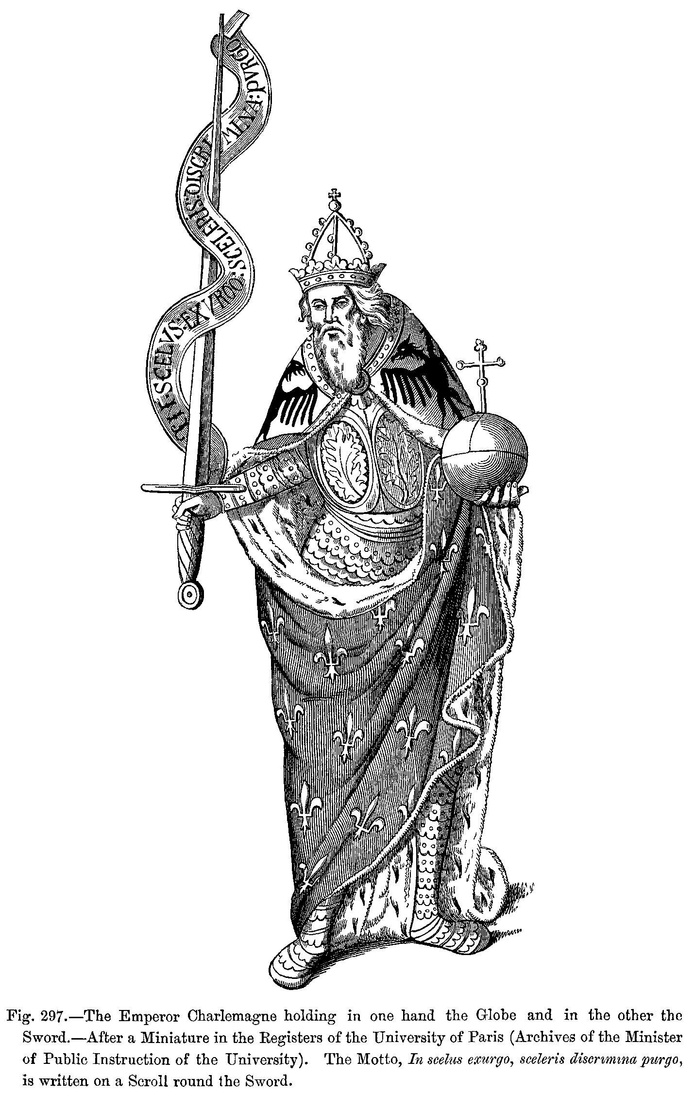 Fig. 411.--Costume of Charles the Simple (Tenth Century).--From a Miniature in the "Rois de France," by Du Tillet, Manuscript of the Sixteenth Century (Imperial Library of Paris).