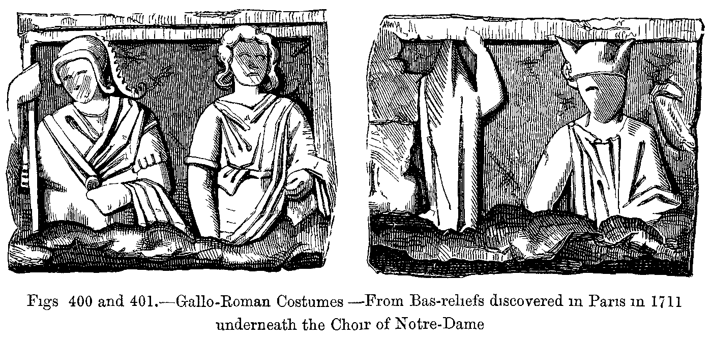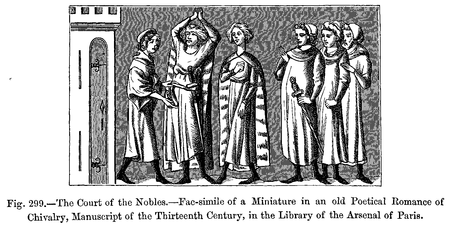 As we approach the fourteenth century--an epoch of the Middle Ages at which, after many changes of fashion, and many struggles against the ancient Roman and German traditions, modern national costume seems at last to have assumed a settled and normal character--we think it right to recapitulate somewhat, with a view to set forth the nature of the various elements which were at work from time to time in forming the fashions in dress. In order to give more weight to our remarks, we will extract, almost word for word, a few pages from the learned and excellent work which M. Jules Quicherat has published on this subject.
