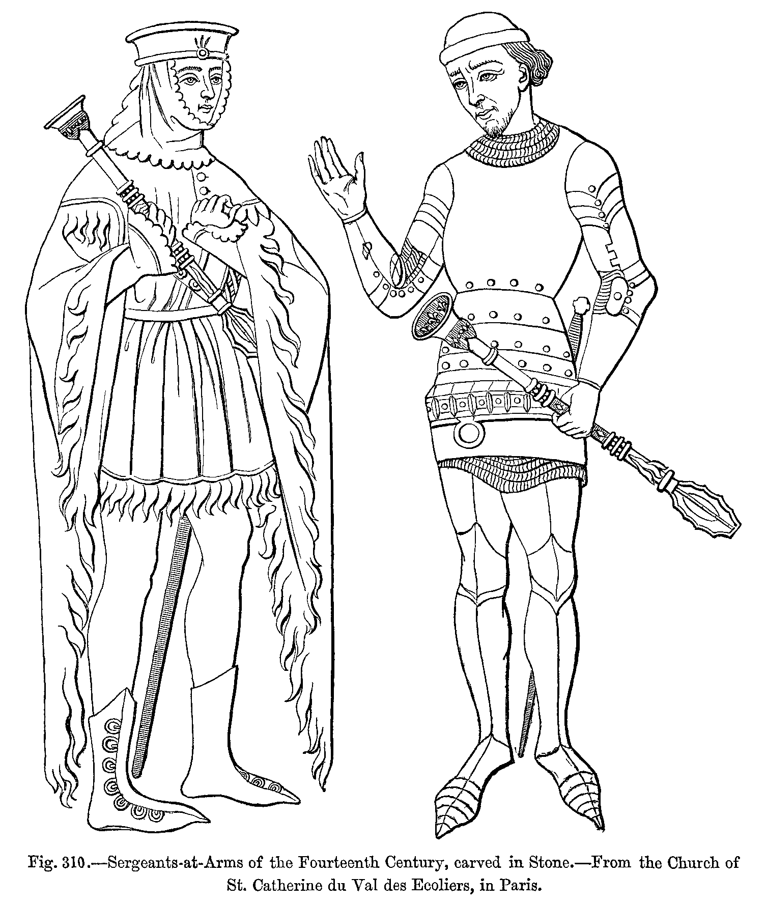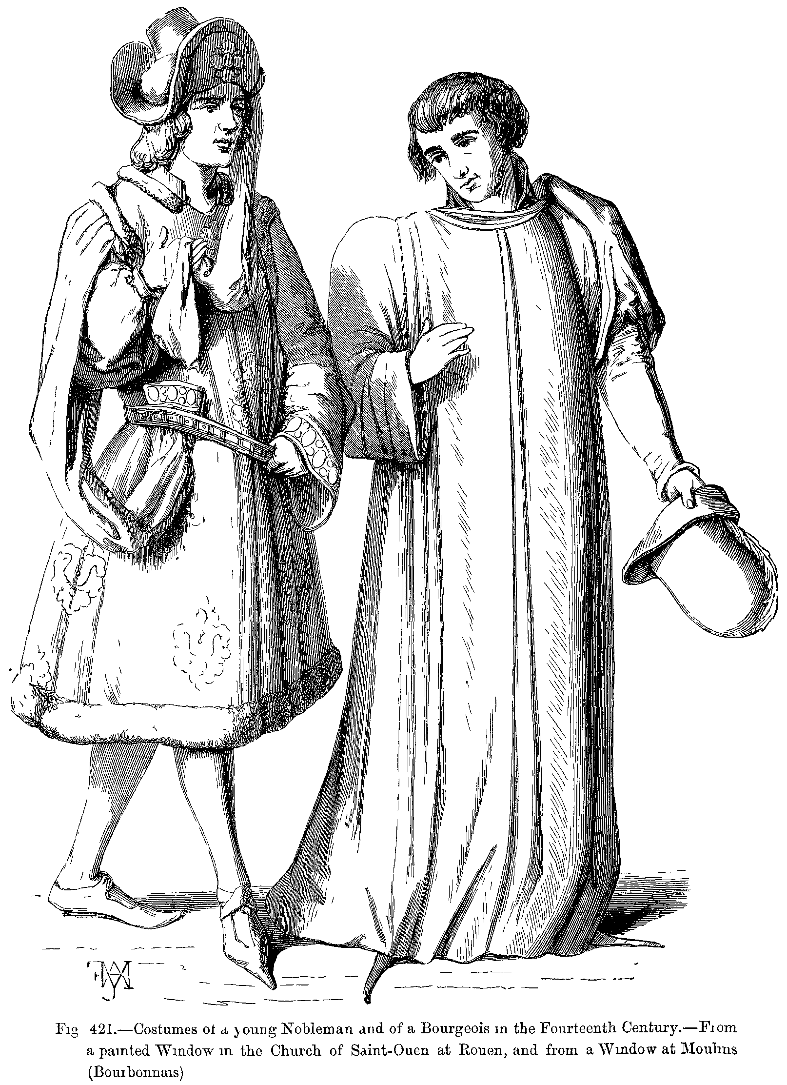 Fig. 421.--Costumes of a young Nobleman and of a Bourgeois in the Fourteenth Century.--From a painted Window in the Church of Saint-Ouen at Rouen, and from a Window at Moulins (Bourbonnais).