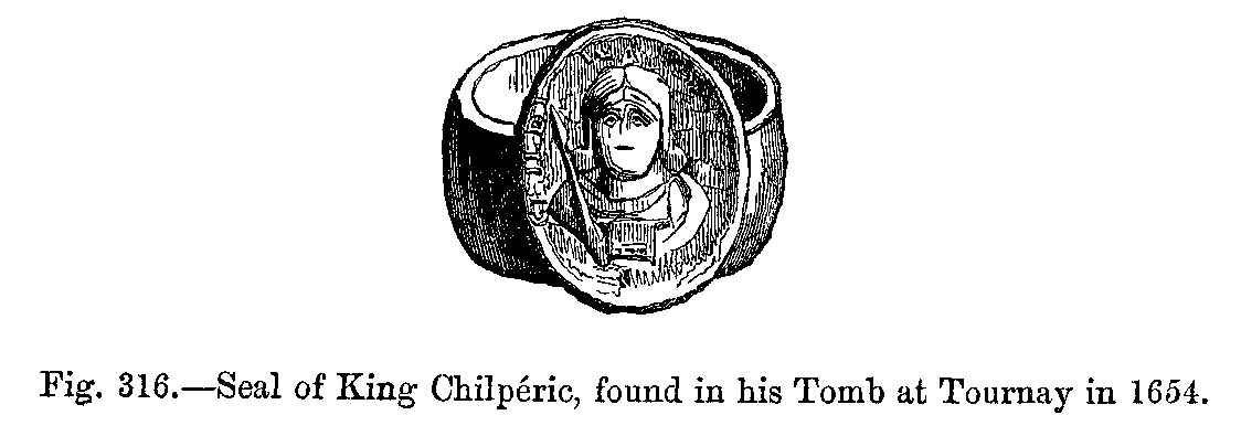 The cloak claims an equally ancient origin. The principal thing worthy of notice is the amount of ornament with which the Franks enriched their girdles and the borders of their tunics and cloaks. This fashion they borrowed from the Imperial court, which, having been transferred from Rome to Constantinople during the third century, was not slow to adopt the luxury of precious stones and other rich decorations commonly in use amongst Eastern nations. Following the example of Horace de Vielcastel, the learned author of a history of the costumes of France, we may here state that it is very difficult, if not impossible, to define the exact costume during the time of the early Merovingian periods. The first writers who have touched upon this subject have spoken of it very vaguely, or not being contemporaries of the times of which they wrote, could only describe from tradition or hearsay. Those monuments in which early costume is supposed to be represented are almost all of later date, when artists, whether sculptors or painters, were not very exact in their delineations of costume, and even seemed to imagine that no other style could have existed before their time than the one with which they were daily familiar. In order to be as accurate as possible, although, after all, we can only speak hypothetically, we cannot do better than call to mind, on the one hand, what Tacitus says of the Germans, that they "were almost naked, excepting for a short and tight garment round their waists, and a little square cloak which they threw over the right shoulder," and, on the other, to carry ourselves back in imagination to the ancient Roman costume. We may notice, moreover, the curious description given of the Franks by Sidoine Apollinaire, who says, "They tied up their flaxen or light-brown hair above their foreheads, into a kind of tuft, and then made it fall behind the head like a horse's tail. The face was clean shaved, with the exception of two long moustaches. They wore cloth garments, fitting tight to the body and limbs, and a broad belt, to which they hung their swords." But this is a sketch made at a time when the Frankish race was only known among the Gauls through its marauding tribes, whose raids, from time to time, spread terror and dismay throughout the countries which they visited. From the moment when the uncultivated tribes of ancient Germany formally took possession of the territory which they had withdrawn from Roman rule, they showed themselves desirous of adopting the more gentle manners of the conquered nation. "In imitation of their chief," says M. Jules Quicherat, the eminent antiquarian, "more than once the Franks doffed the war coat and the leather Belt, and assumed the toga of Roman dignity. More than once their flaxen hair was shown to advantage by flowing over the imperial mantle, and the gold of the knights, the purple of the senators and patricians, the triumphal crowns, the fasces, and, in short, everything which the Roman Empire invented in order to exhibit its grandeur, assisted in adding to that of our ancestors."