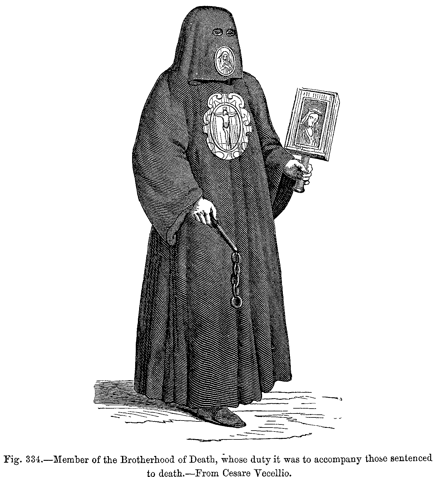 "Lastly, we have to mention the chape, which was always regarded as a necessary article of dress. The chape was the only protection against bad weather at a period when umbrellas and covered carriages were unknown. It was sometimes called chape de pluie, on account of the use to which it was applied, and it consisted of a large cape with sleeves, and was completely waterproof. It was borne behind a master by his servant, who, on account of this service was called a porte-chape. It is needless to say that the common people carried it themselves, either slung over their backs, or folded under the arm."