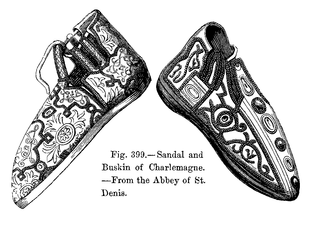 We shall commence our historical sketch from the fifth century, at which period we can trace the blending of the Roman with the barbaric costume--namely, the combination of the long, shapeless garment with that which was worn by the Germans, and which was accompanied by tight-fitting braies. Thus, in the recumbent statue which adorned the tomb of Clovis, in the Church of the Abbey of St. Geneviève, the King is represented as wearing the tunic and the toga, but, in addition, Gallo-Roman civilization had actually given him tight-fitting braies, somewhat similar to what we now call pantaloons. Besides this, his tunic is fastened by a belt; which, however, was not a novelty in his time, for the women then wore long dresses, fastened at the waist by a girdle. There is nothing very remarkable about his shoes, since we find that the shoe, or closed sandal, was worn from the remotest periods by nearly all nations (Figs. 402 and 403).