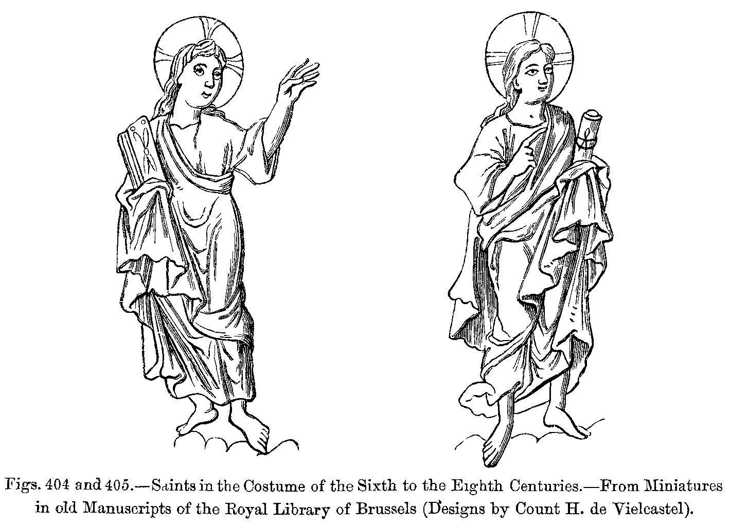 Figs. 404 and 405.--Saints in the Costume of the Sixth to the Eighth Centuries.--From Miniatures in old Manuscripts of the Royal Library of Brussels (Designs by Count H. de Vielcastel).