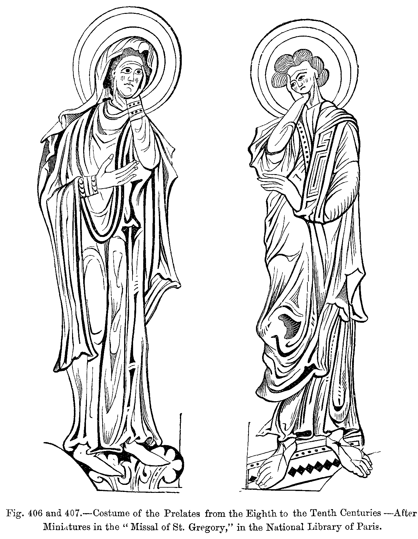 Fig. 406 and 407.--Costume of the Prelates from the Eighth to the Tenth Centuries--After Miniatures in the "Missal of St. Gregory," in the National Library of Paris.