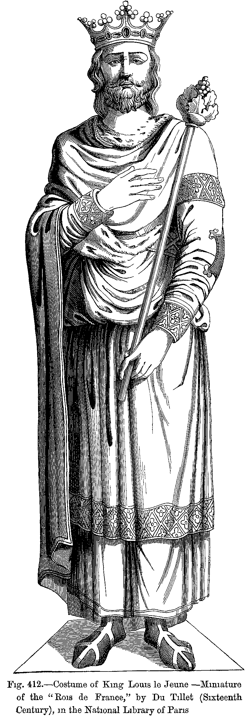 Fig. 412.--Costume of King Louis le Jeune--Miniature of the "Rois de France," by Du Tillet (Sixteenth Century), in the National Library of Paris.