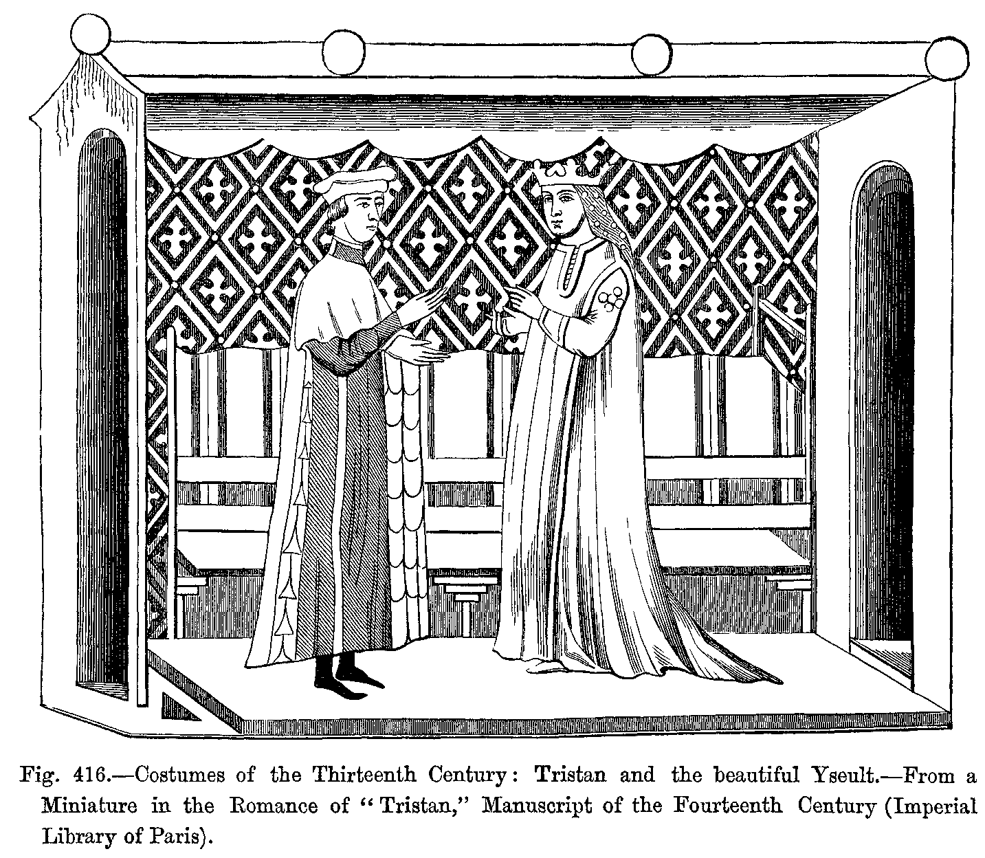 Fig. 416.--Costumes of the Thirteenth Century: Tristan and the beautiful Yseult.--From a Miniature in the Romance of "Tristan," Manuscript of the Fourteenth Century (Imperial Library of Paris).