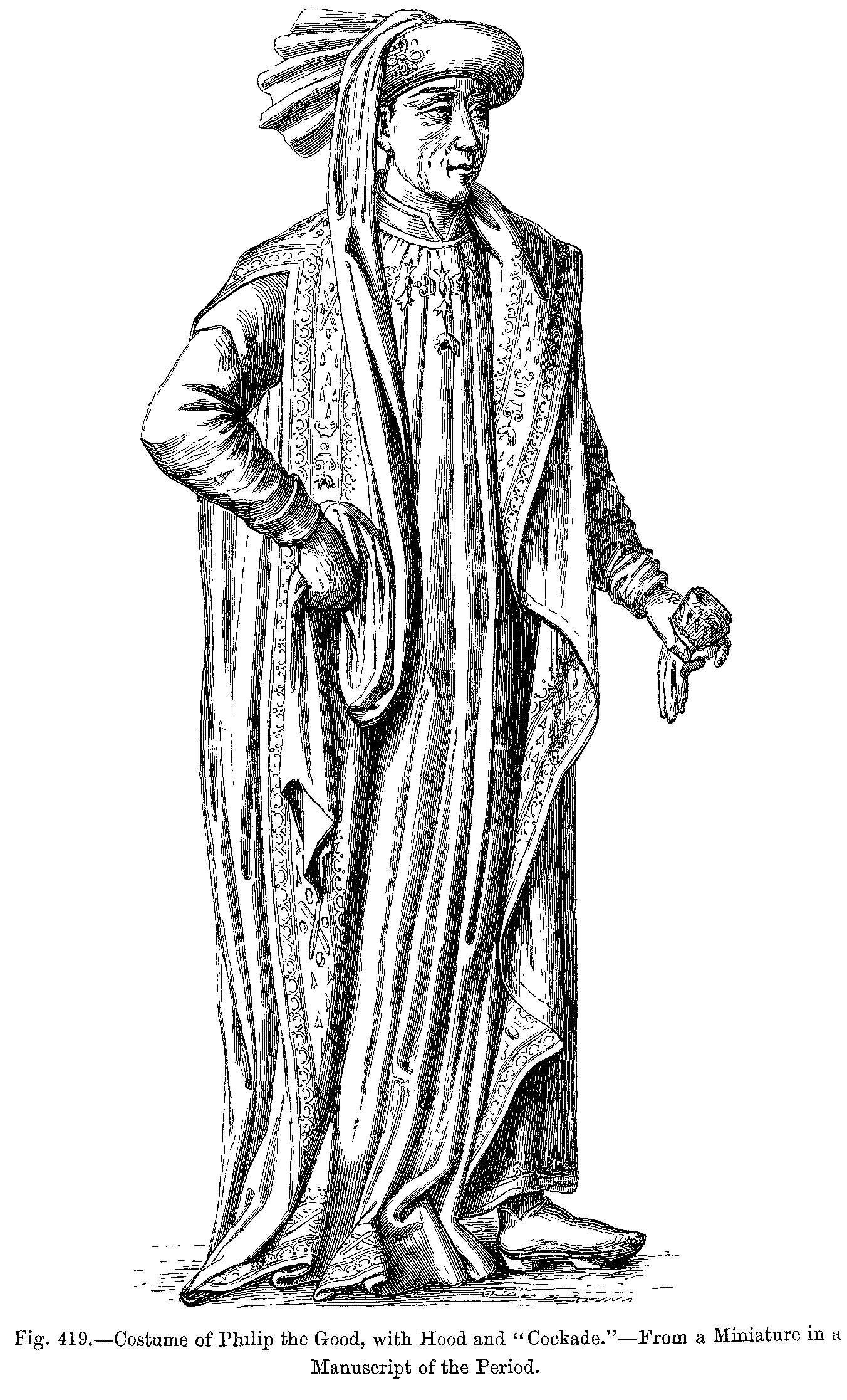 Fig. 419.--Costume of Philip the Good, with Hood and "Cockade."--From a Miniature in a Manuscript of the Period.