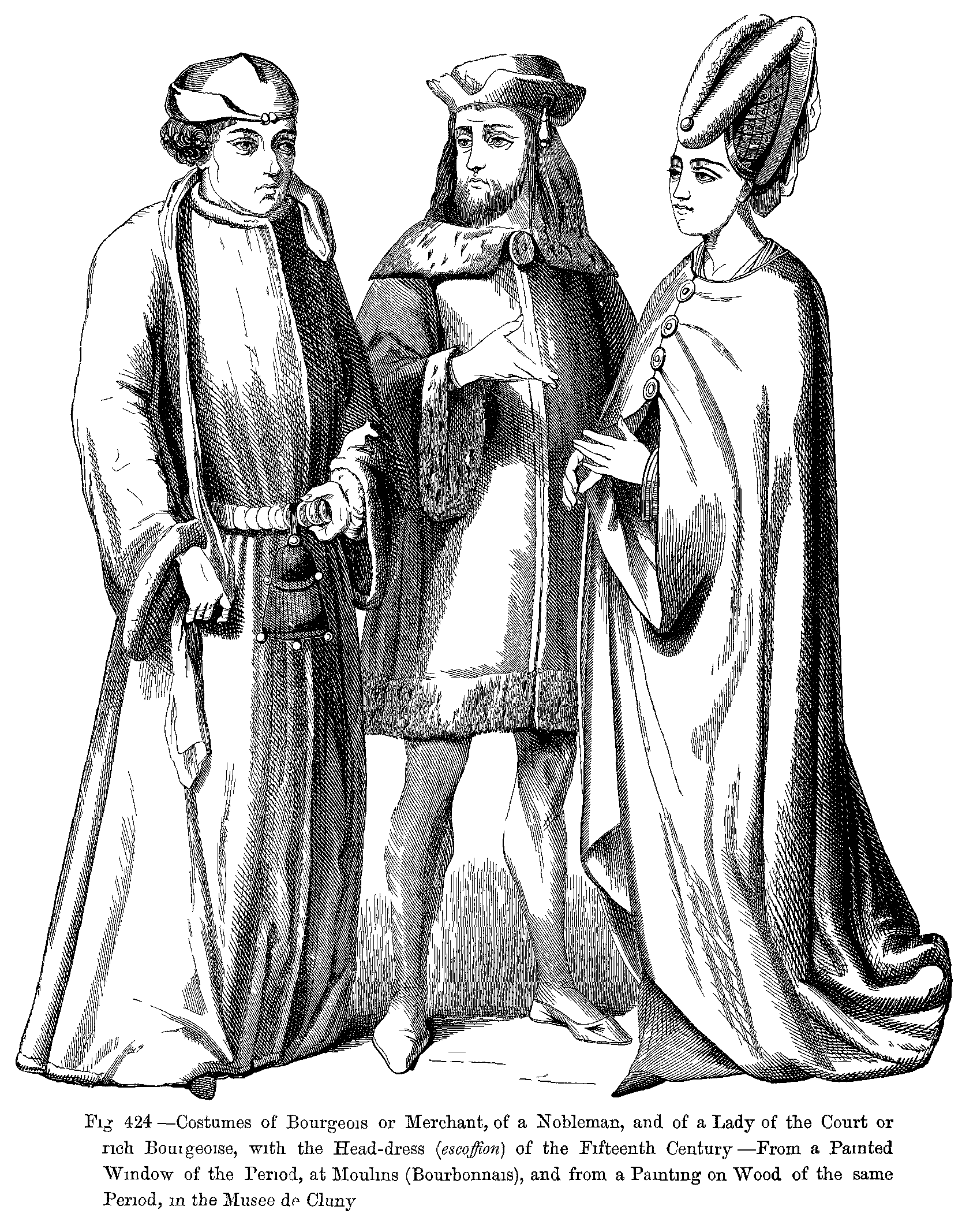 Fig. 424.--Costumes of Bourgeois or Merchant, of a Nobleman, and of a Lady of the Court or rich Bourgeoise, with the Head-dress (escoffion) of the Fifteenth Century.--From a Painted Window of the Period, at Moulins (Bourbonnais), and from a Painting on Wood of the same Period, in the Musee de Cluny.