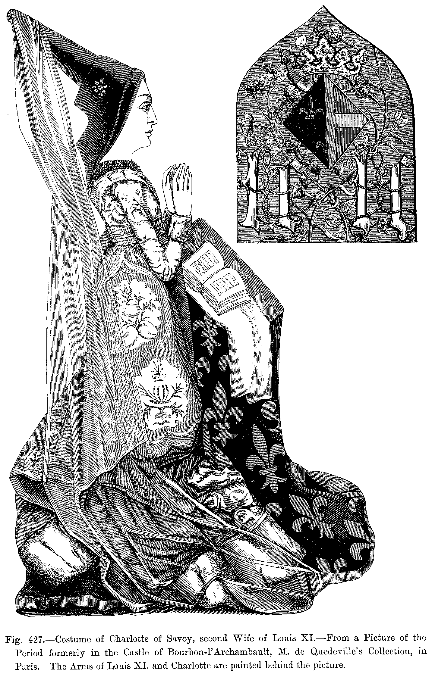 Fig. 427.--Costume of Charlotte of Savoy, second Wife of Louis XI.--From a Picture of the Period formerly in the Castle of Bourbon-l'Archambault, M. de Quedeville's Collection, in Paris. The Arms of Louis XI. and Charlotte are painted behind the picture.