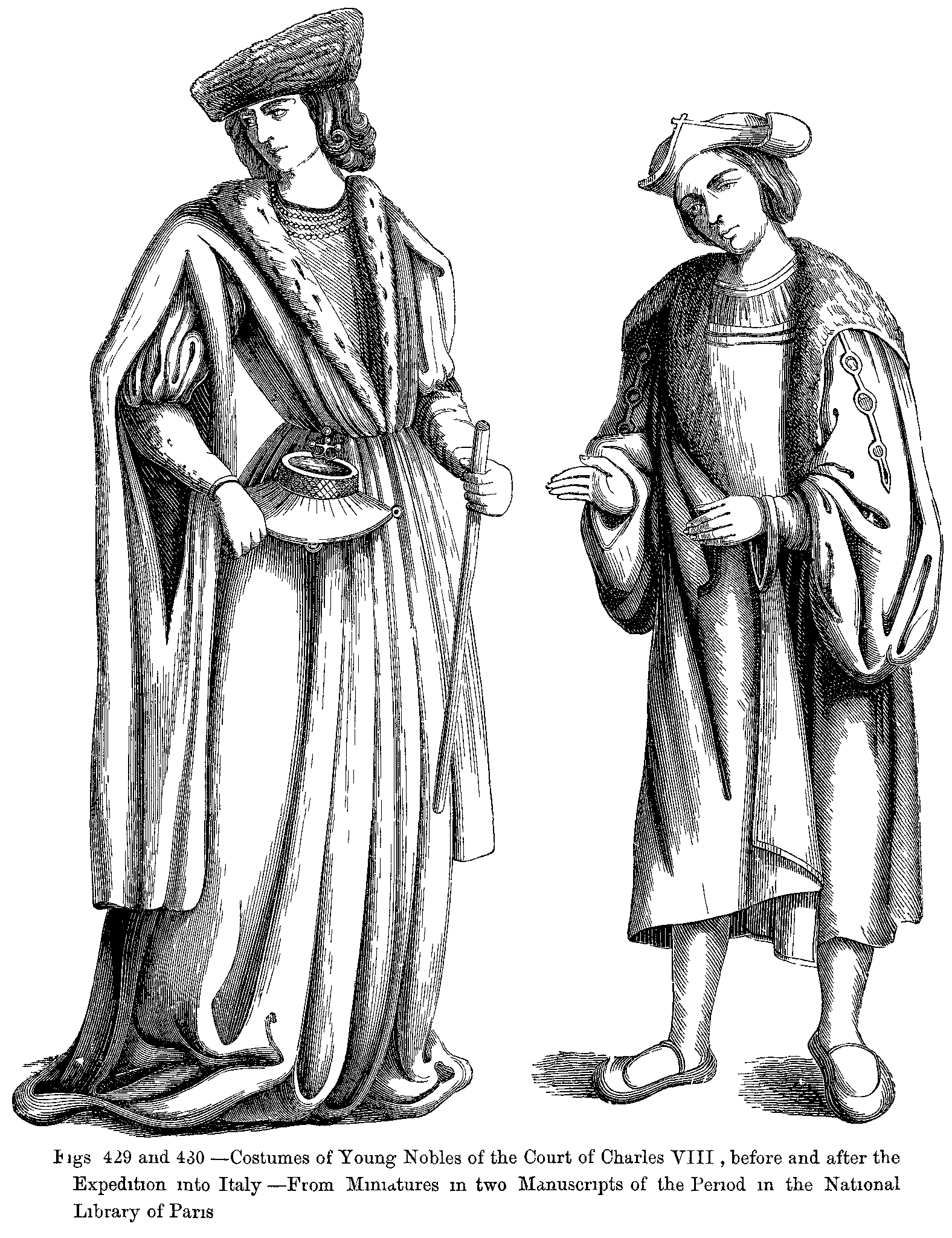 Figs. 429 and 430.--Costumes of Young Nobles of the Court of Charles VIII., before and after the Expedition into Italy.--From Miniatures in two Manuscripts of the Period in the National Library of Paris.