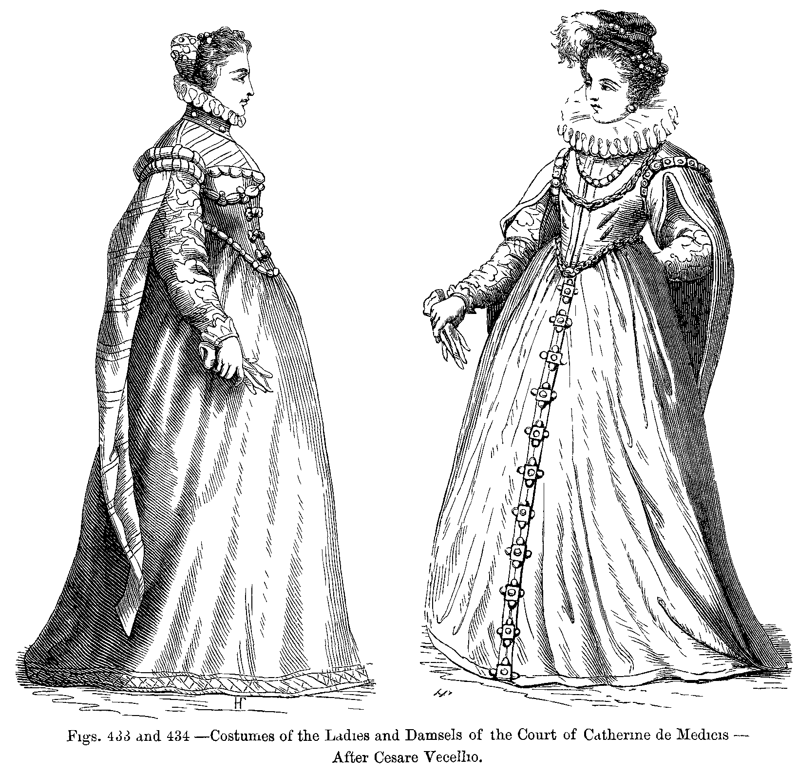 Figs. 433 and 434.--Costumes of the Ladies and Damsels of the Court of Catherine de Medicis.--After Cesare Vecellio.