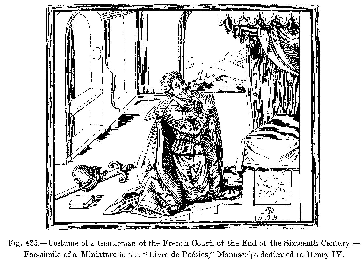 Fig. 435.--Costume of a Gentleman of the French Court, of the End of the Sixteenth Century.--Fac-simile of a Miniature in the "Livre de Poésies," Manuscript dedicated to Henry IV.