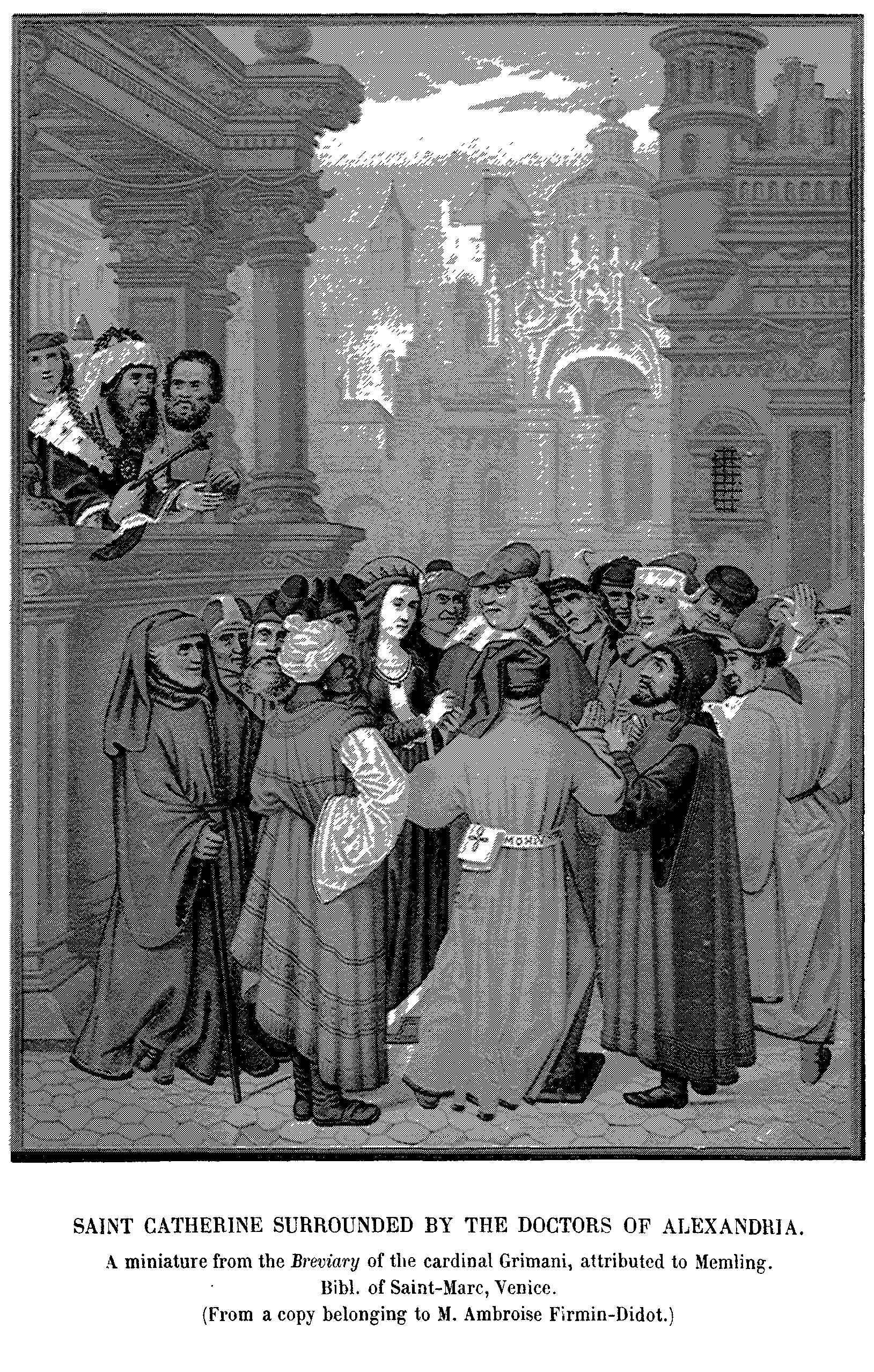 14. St. Catherine surrounded by the Doctors of Alexandria. A Miniature from the Breviary of Cardinal Grimani, attributed to Memling. Costumes of the Fifteenth Century.