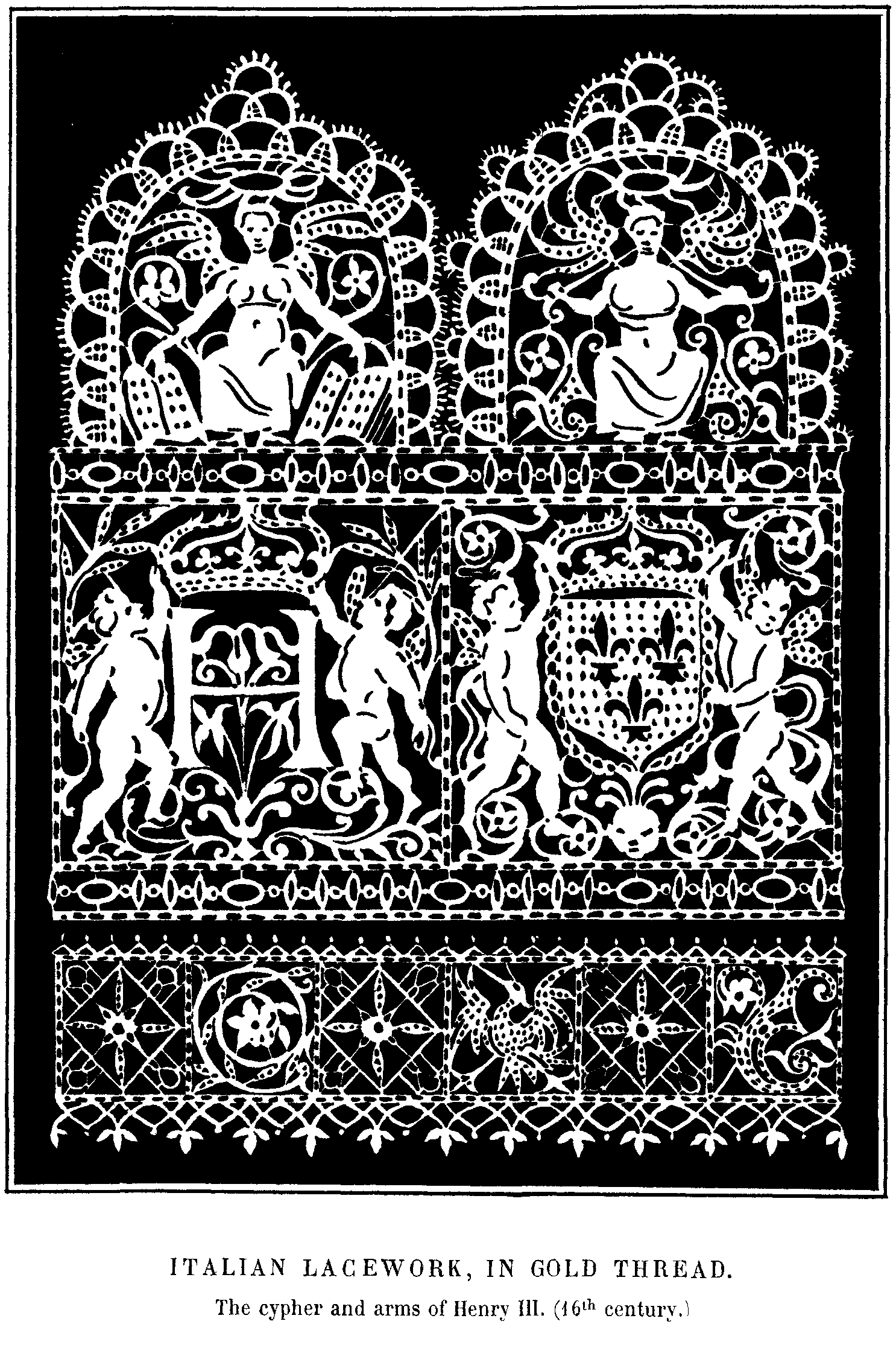 15. Italian Lace-work, in Gold-thread. The Cypher and Arms of Henri III. (Sixteenth Century).