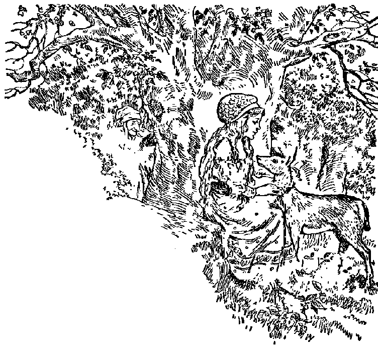 At first the Sister wept over her little, changed Brother, and he wept too, and knelt by her, very sorrowful; but at last the maiden said, "Be still, dear little fawn, and I will never forsake you!" and, taking off her golden garter, she placed it around his neck, and, weaving rushes, made a girdle to lead him with. This she tied to him, and taking the other end in her hand, she led him away, and they travelled deeper and deeper into the forest. After they had gone a long distance they came to a little hut, and the maiden, peeping in, found it empty, and thought, "Here we can stay and dwell." Then she looked for leaves and moss to make a soft couch for the Fawn, and every morning she went out and collected roots and berries and nuts for herself, and tender grass for the Fawn. In the evening when the Sister was tired, and had said her prayers, she laid her head upon the back of the Fawn, which served for a pillow, on which she slept soundly. Had but the Brother regained his own proper form, their lives would have been happy indeed.