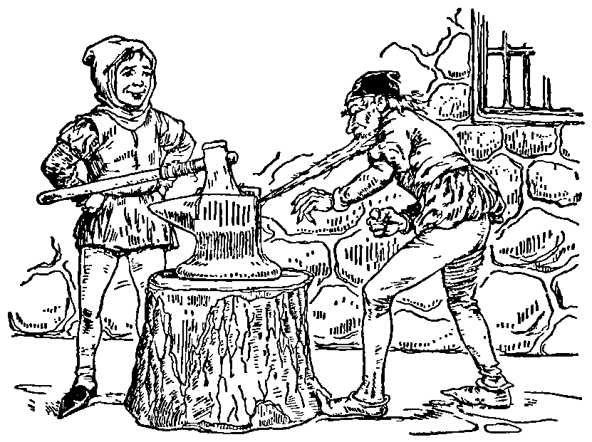 "What are you gazing at?" cried the dwarf, at the same time becoming red with rage; "and what are you standing there for, making ugly faces?" It is probable that he might have proceeded in the same complimentary manner, but suddenly a great growl was heard near by them, and a big black bear joined the party. Up jumped the dwarf in extremest terror, but could not get to his hiding-place, the bear was too close to him; so he cried out in very evident anguish—