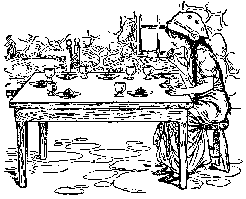 said the maiden, and immediately a table covered with a white cloth stood before her, with a knife and fork, and silver spoon; and the most delicate dishes were ranged in order upon it, and everything as warm as if they had been just taken away from the fire. Two-Eyes said a short grace, and then began to eat; and when she had finished she pronounced the words which the wise Woman had told her: