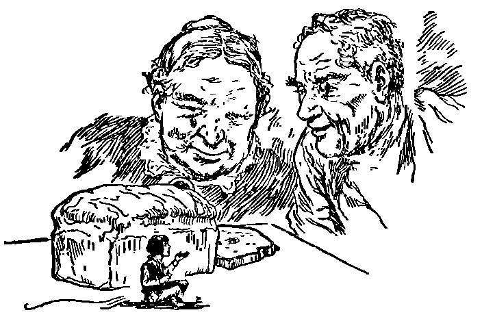 "We will go in there," said Hansel, "and have a glorious feast. I will eat a piece of the roof, and you can eat the window. Will they not be sweet?" So Hansel reached up and broke a piece off the roof, in order to see how it tasted, while Grethel stepped up to the window and began to bite it. Then a sweet voice called out in the room, "Tip-tap, tip-tap, who raps at my door?" and the children answered, "the wind, the wind, the child of heaven"; and they went on eating without interruption. Hansel thought the roof tasted very nice, so he tore off a great piece; while Grethel broke a large round pane out of the window, and sat down quite contentedly. Just then the door opened, and a very old woman, walking upon crutches, came out. Hansel and Grethel were so frightened that they let fall what they had in their hands; but the old woman, nodding her head, said, "Ah, you dear children, what has brought you here? Come in and stop with me, and no harm shall befall you"; and so saying she took them both by the hand, and led them into her cottage. A good meal of milk and pancakes, with sugar, apples, and nuts, was spread on the table, and in the back room were two nice little beds, covered with white, where Hansel and Grethel laid themselves down, and thought themselves in heaven. The old woman behaved very kindly to them, but in reality she was a wicked witch who waylaid children, and built the bread-house in order to entice them in, but as soon as they were in her power she killed them, cooked and ate them, and made a great festival of the day. Witches have red eyes, and cannot see very far; but they have a fine sense of smelling, like wild beasts, so that they know when children approach them. When Hansel and Grethel came near the witch's house she laughed wickedly, saying, "Here come two who shall not escape me." And early in the morning, before they awoke, she went up to them, and saw how lovingly they lay sleeping, with their chubby red cheeks, and she mumbled to herself, "That will be a good bite." Then she took up Hansel with her rough hands, and shut him up in a little cage with a lattice-door; and although he screamed loudly it was of no use. Grethel came next, and, shaking her till she awoke, the witch said, "Get up, you lazy thing, and fetch some water to cook something good for your brother, who must remain in that stall and get fat; when he is fat enough I shall eat him." Grethel began to cry, but it was all useless, for the old witch made her do as she wished. So a nice meal was cooked for Hansel, but Grethel got nothing but a crab's claw.