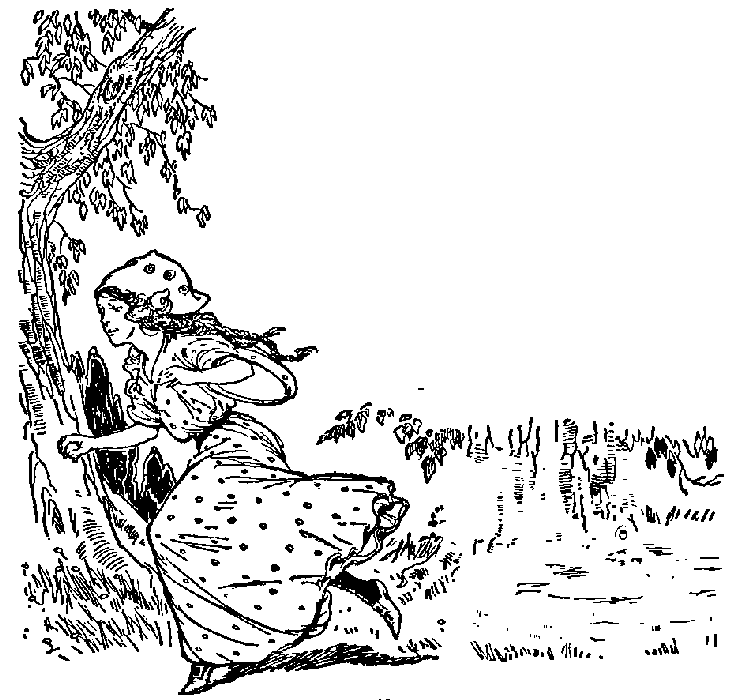 Then they went out of the city, driving the geese. And when they came to the meadow, the princess sat down upon a bank there and let down her waving locks of hair, which were all of pure gold; and when Curdken saw it glitter in the sun, he ran up, and would have pulled some of the locks out; but she cried—