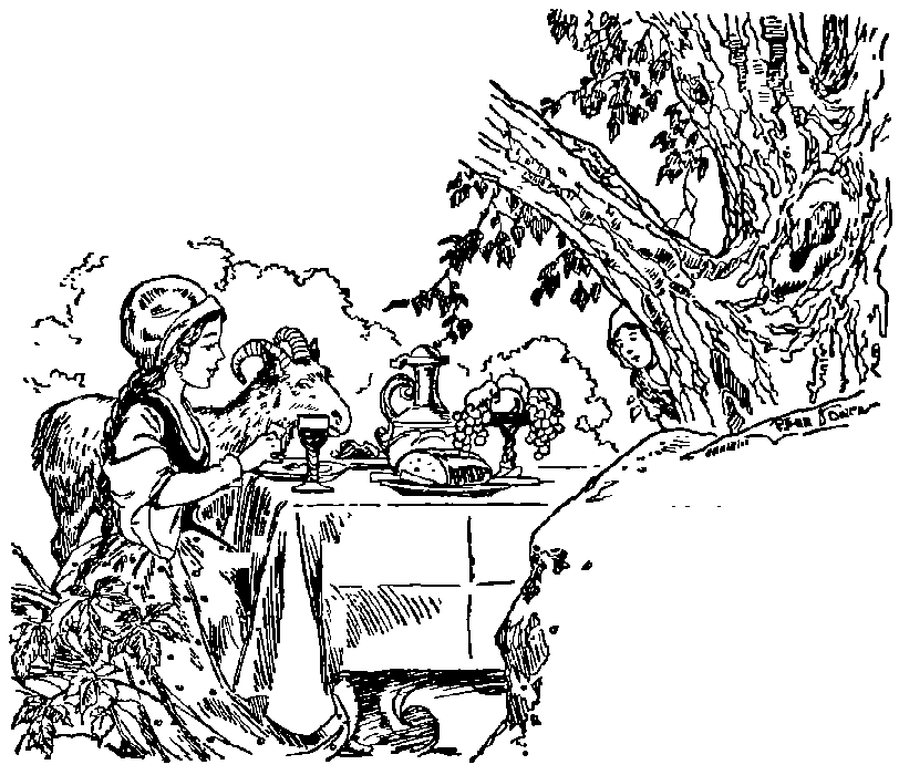 Once it happened that Two-Eyes had to go into the forest to tend the goat; and she went very hungry, because her sisters had given her very little to eat that morning. She sat down upon a hillock, and cried so much that her tears flowed almost like rivers out of her eyes! By and by she looked up and saw a Woman standing by, who asked, "Why are you weeping, Two-Eyes?" "Because I have two eyes like ordinary people," replied the maiden, "and therefore my mother and sisters dislike me, push me into corners, throw me their old clothes, and give me nothing to eat but what they leave. To-day they have given me so little that I am still hungry." "Dry your eyes, then, now," said the wise Woman; "I will tell you something which shall prevent you from being hungry again. You must say to your goat:
